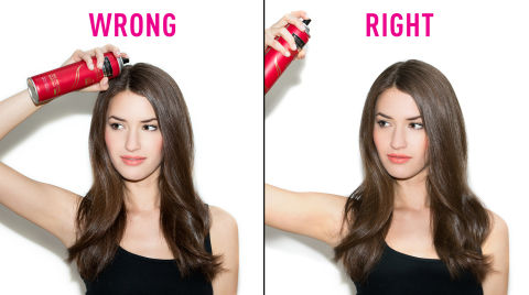 4. You hold the nozzle of your hairspray too close to your hair.Spraying hairspray too close to your hair will concentrate the formula in one spot, leaving it crunchy and not touchable. Instead, Syfu suggests holding a hairspray, like TRESemmé Keratin Smooth Frizz-Free Hold Hairspray, about 12 inches away from your hair, aiming it at an angle so that you get a light mist all over.