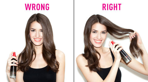 5. You only spray the ends of your hair with a lightweight conditioning spray, since you think that's the driest part of your strands. "Actually, lightweight conditioners keep frizz down and promotes healthy, hydrated hair, so it's smart to apply them on damp hair from roots to tips or, if you have fine hair, spray your hair from mid-length down to keep your volume in tact," Syfu says. She recommends TRESemmé Renewal Hair & Scalp Conditioning Spray, which you can layer with any styling product after.