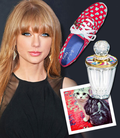 VANITY: Red lipsticks and lip stains; daily contact lenses; face wash; moisturizer; cat treats; and my new fragrance, Taylor by Taylor Swift.