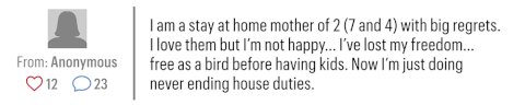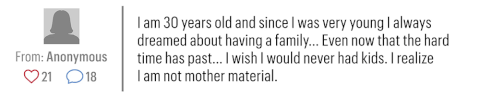 Not surprisingly, the movement has gained most of its traction on the internet, in anonymous chat rooms and on buried message boards, vestiges of safe spaces for women online. There are sub-communities on Quora and Reddit—even a Facebook group called "I Regret Having Children"—with mothers tapping out desperate messages of shame, disappointment, and fear. "I am 30 years old and since I was very young I always dreamed about having a family," one anonymous commenter writes. "I wish I would never had kids [sic]. I realize I am not mother material, and I am terrified thinking how I am going to be forced to take care of it."