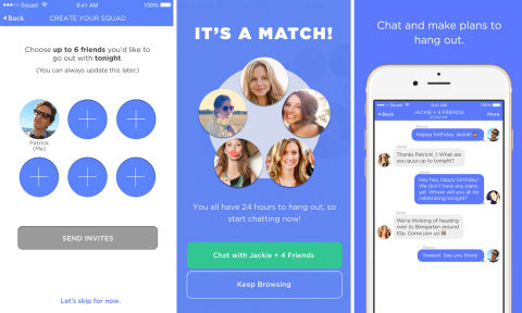 Here's how it works: Grab one to five friends. Make a profile. Swipe right on the squads you'd like to conquer er, meet in person. Chat with your matches within a 24-hour window. Arrange to meet. Charm them all into swearing their undying loyalty to you. Repeat.