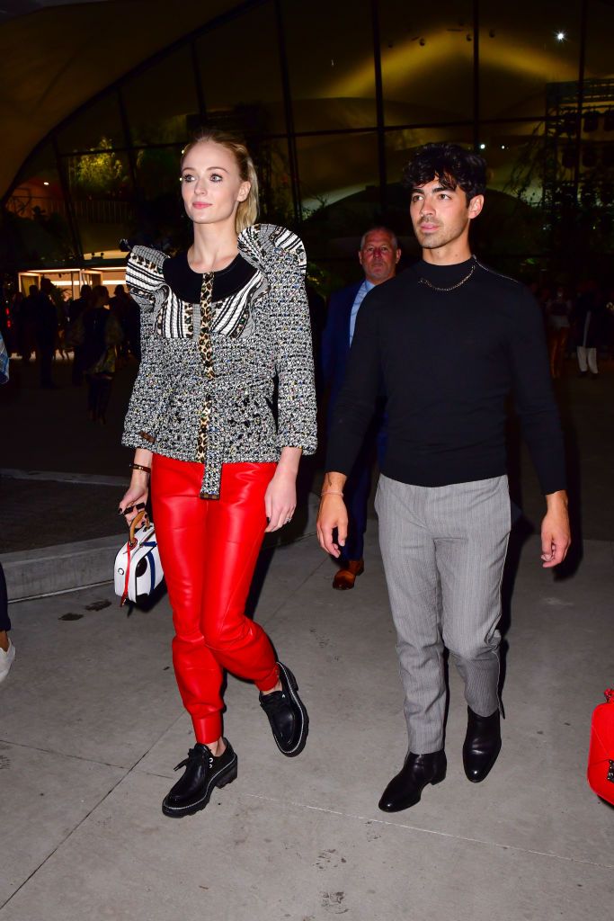 Sophie Turner and Joe Jonas were seen leaving the Louis Vuitton Cruise 2020 Show at JFK wearing Louis Vuitton.