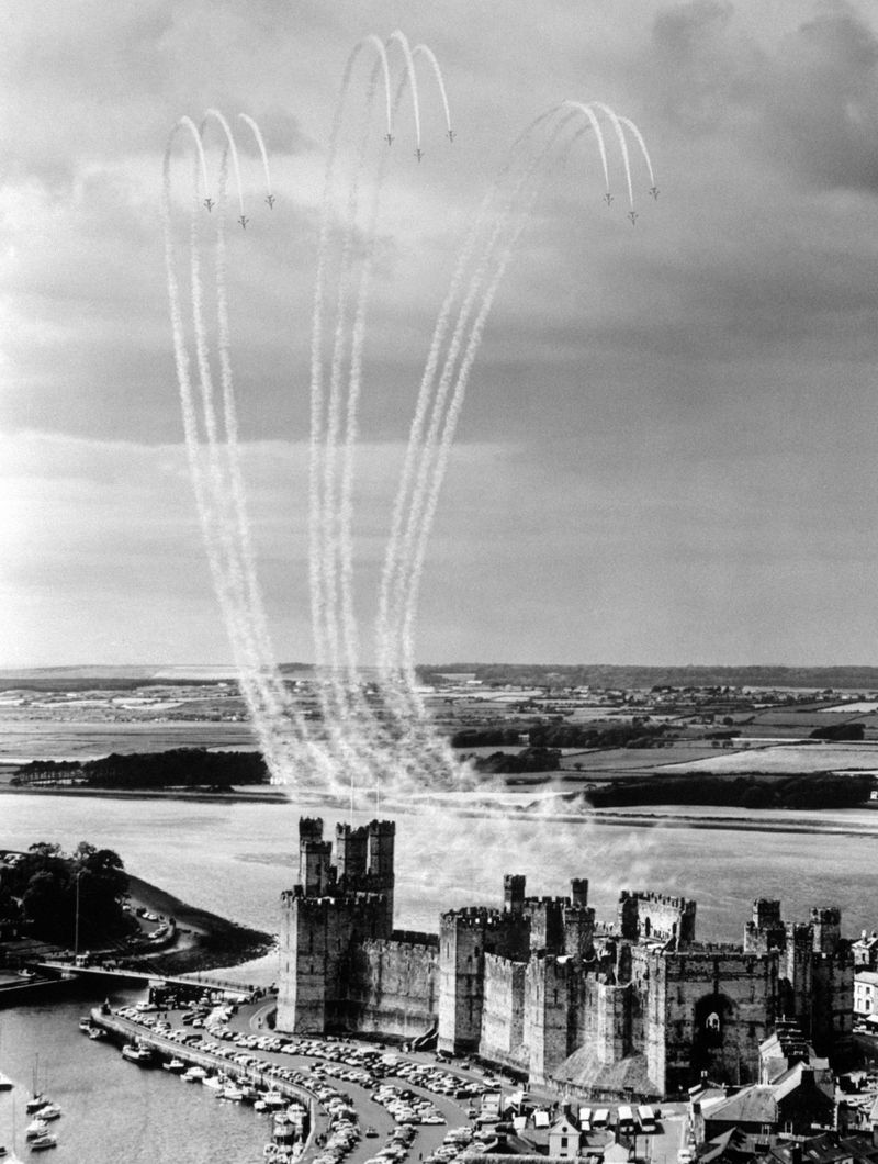 On their wedding day, celebrations were seen throughout the United Kingdom. In Wales, the Royal Air Force performed a formation of the Prince of Wales Feathers over Caernarfon Castle.