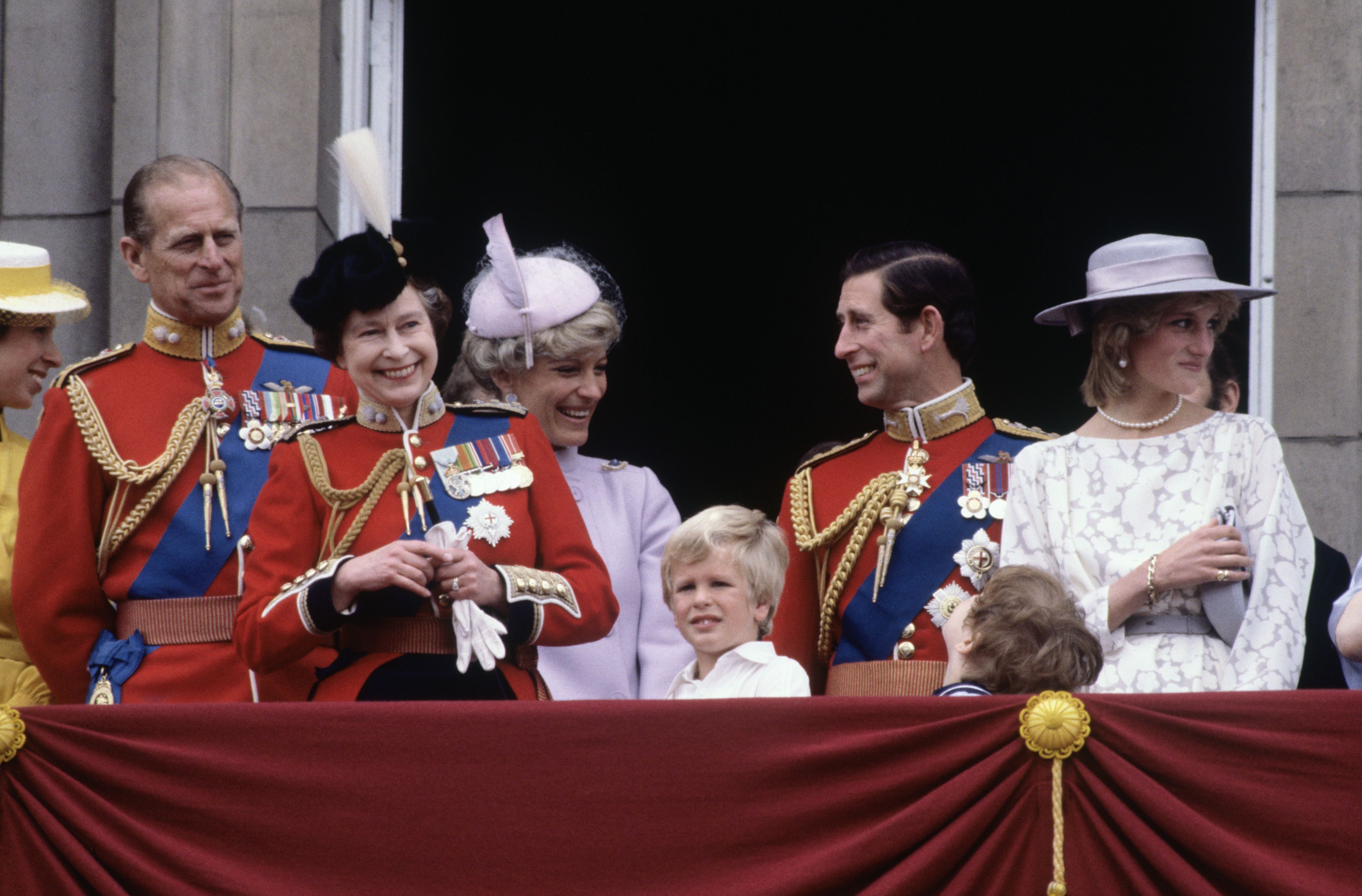 Queen Elizabeth II with Princess Anne, Prince Phillip, Princess Michael of Kent (a member of the British royal family who's married to the Queen's first cousin), Peter Phillips (Princess Anne's son), Prince Charles, and Princess Diana at the Trooping the Colour ceremony in London.