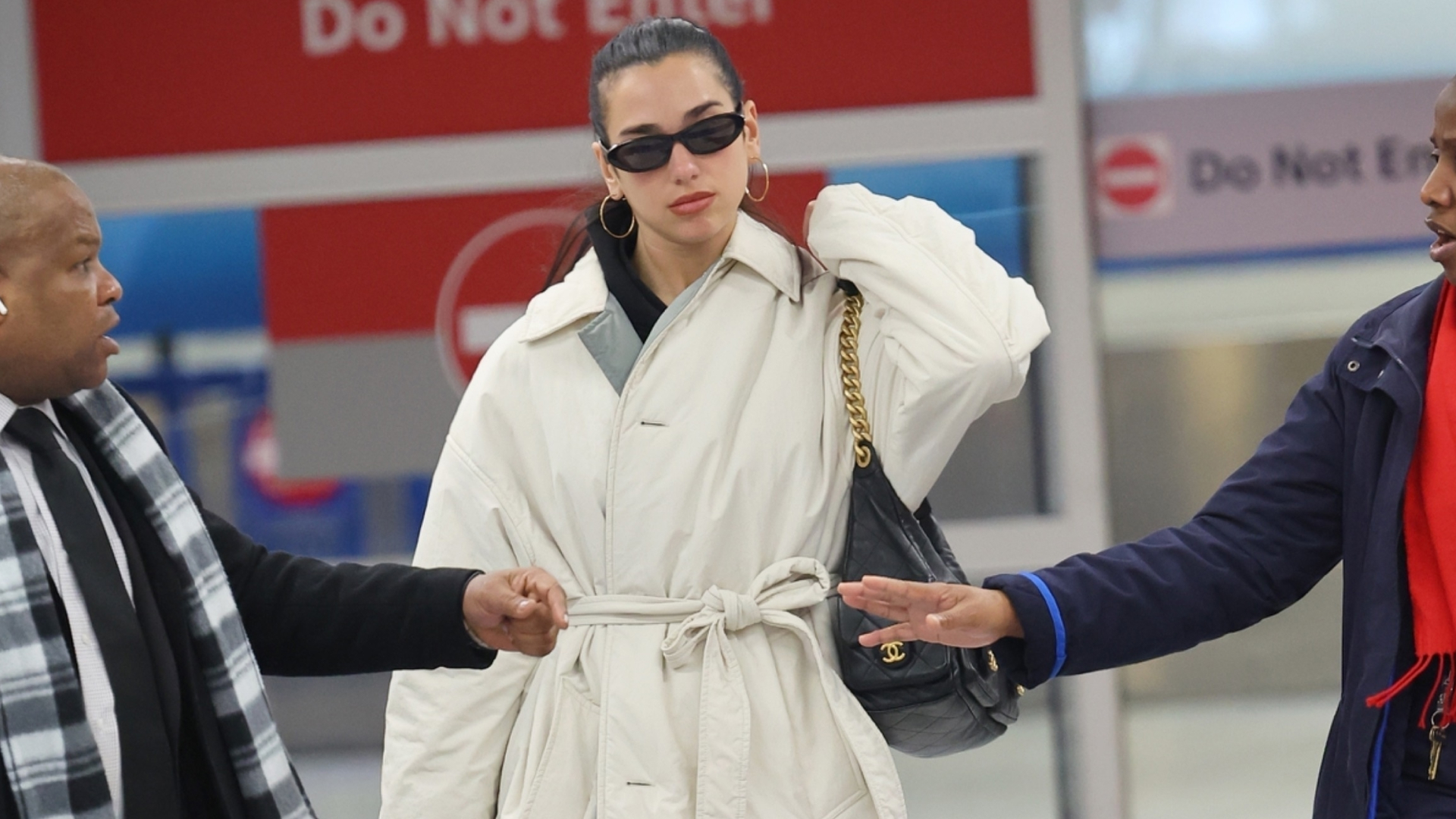 Dua Lipa's Maximalist Airport Outfit Pairs a Sleeping Bag Coat and Puma Sneakers with Chanel and a Tricked-Out Birkin