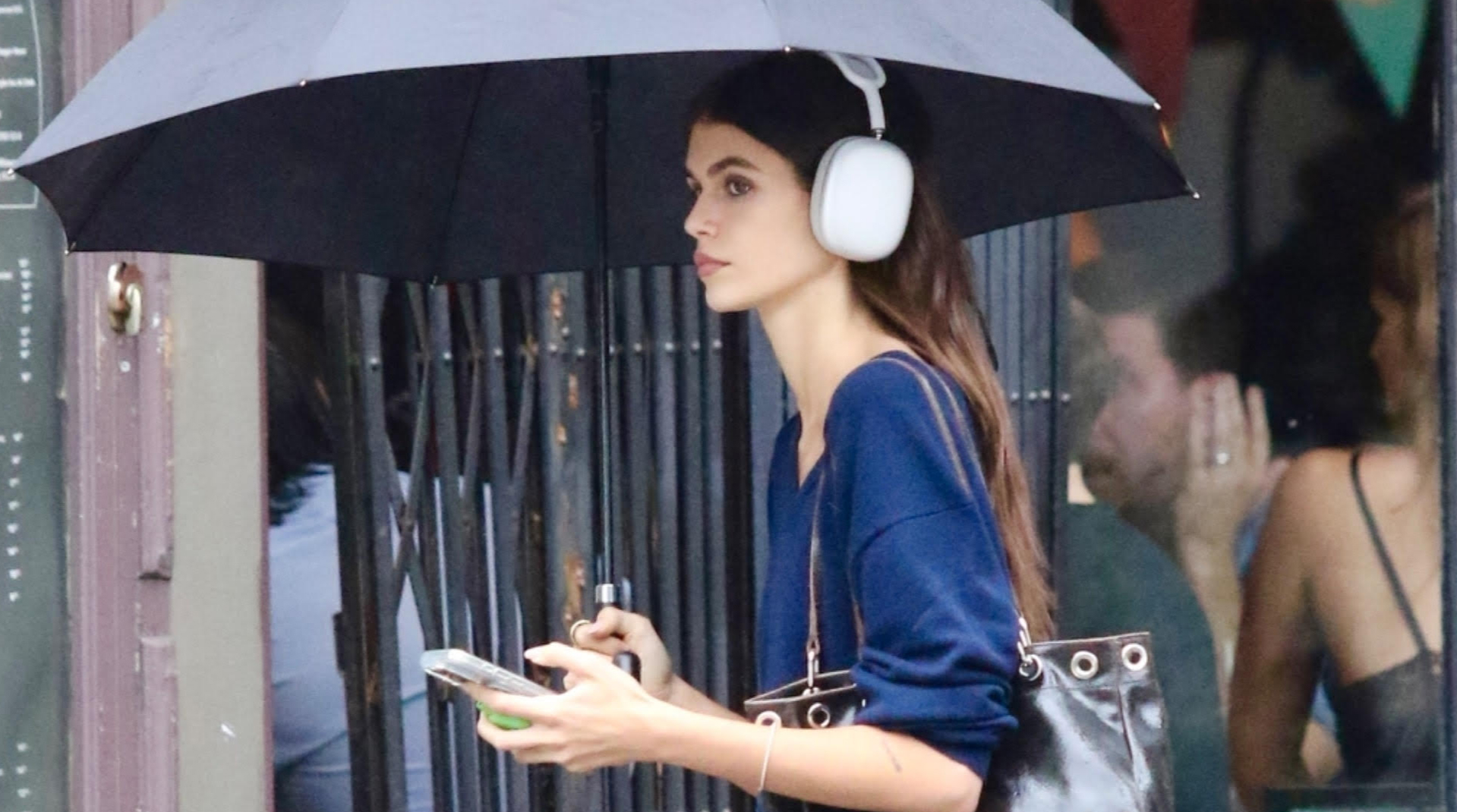 Recently, Gerber was spotted walking the rainy streets of New York City wearing a pair of low-rise, wide-legged indigo jeans and her go-to pair of sneakers—black Onitsuka Tiger Mexico 66s with white detailing.
