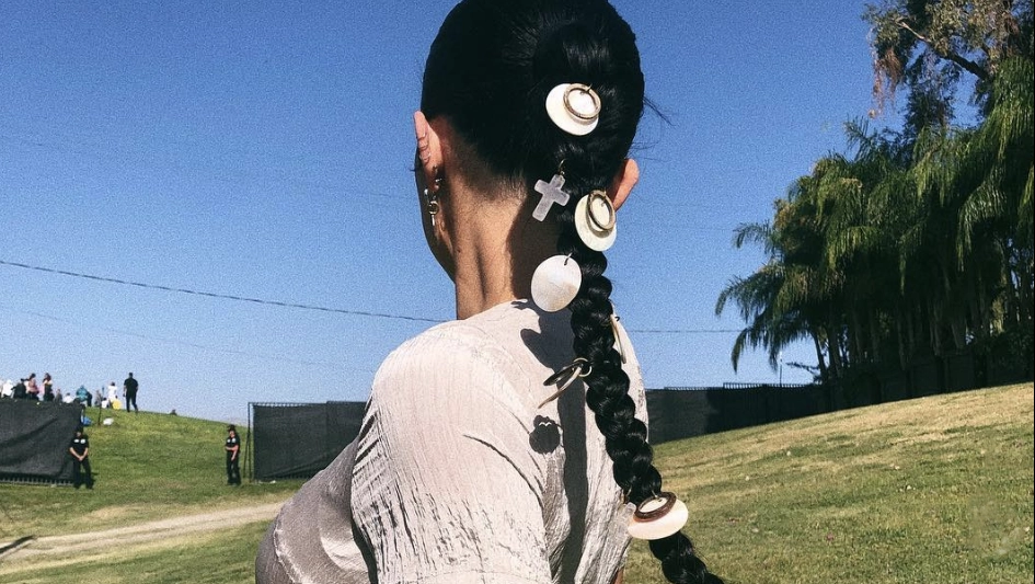 Normally a fan of brightly colored, bold cut wigs for the festival, Kylie instead went for a super sleek braid. Using long extensions for the style, she adorned the braid with a ton of extra detailing, weaving in white seashells and gold hoops, along with clear crosses in a nod to Easter Sunday.