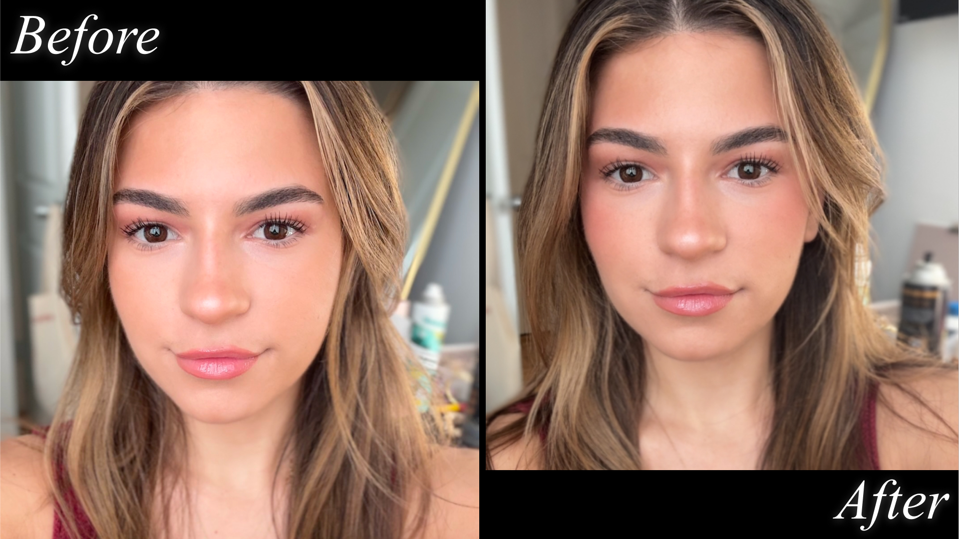 Emma Aerin Becker before and after using Westman Atelier Baby Cheeks Powder Blush Duo.