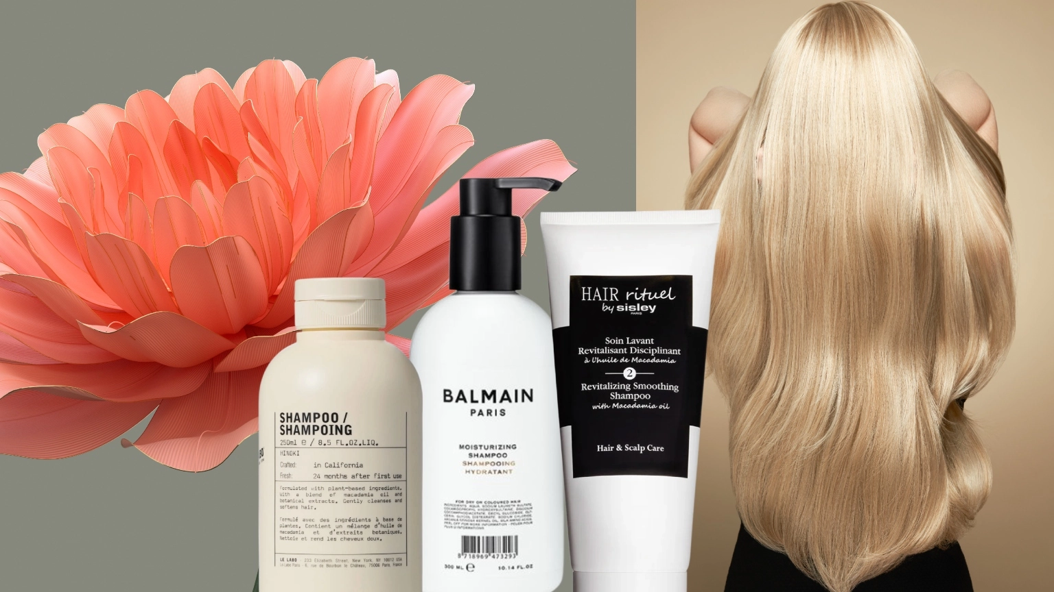 a trio of white shampoo bottles on a background of a pink flower next to a woman with long shiny blonde hair