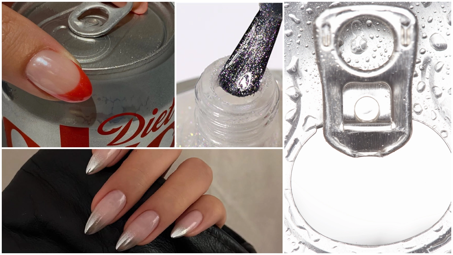 Diet Coke’s silver can might be the most recognizable part of the whole thing. A chrome tip that fades into a neutral base captures that metallic shine without feeling over-the-top.