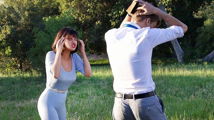 In case you need a reminder, the dress in question is the green, sparkly, feathery number that Selena wears in the party sequences at the beginning and end of the video. You know, the ones that are very awkward:
