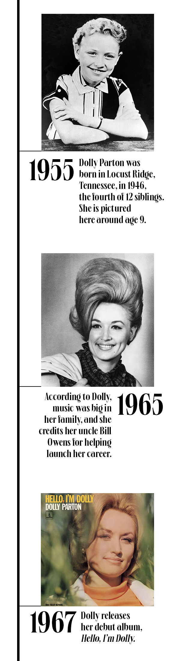 Dolly timeline images, chronologically: Michael Ochs Archive/Getty Images, Michael Ochs Archives/Getty Images, Monument Records, Michael Ochs Archives/Getty Images, RCA, Bettmann/Getty Images, Courtesy Everett Collection, Ron Galella/Ron Galella Collection via Getty Images, 20th Century Fox/Kobal/Shutterstock, Jerry Fitzgerald/Walt Disney Television via Getty Images, Ron Davis/Getty Images, Scott Suchman/WireImage/Getty Images, Shirlaine Forrest/WireImage/Getty Images, Michael Loccisano/Getty Images, Kevin Winter/Getty Images for The Recording Academy, CMT, Chronicle Books, Netflix, NBC News