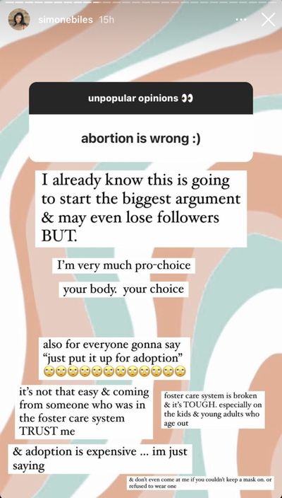 Earlier this week, Simone Biles responded to "unpopular opinions" from fans on her Instagram Stories. When one person offered the opinion that "abortion is wrong :)," Biles came prepared with a strong pro-choice stance.