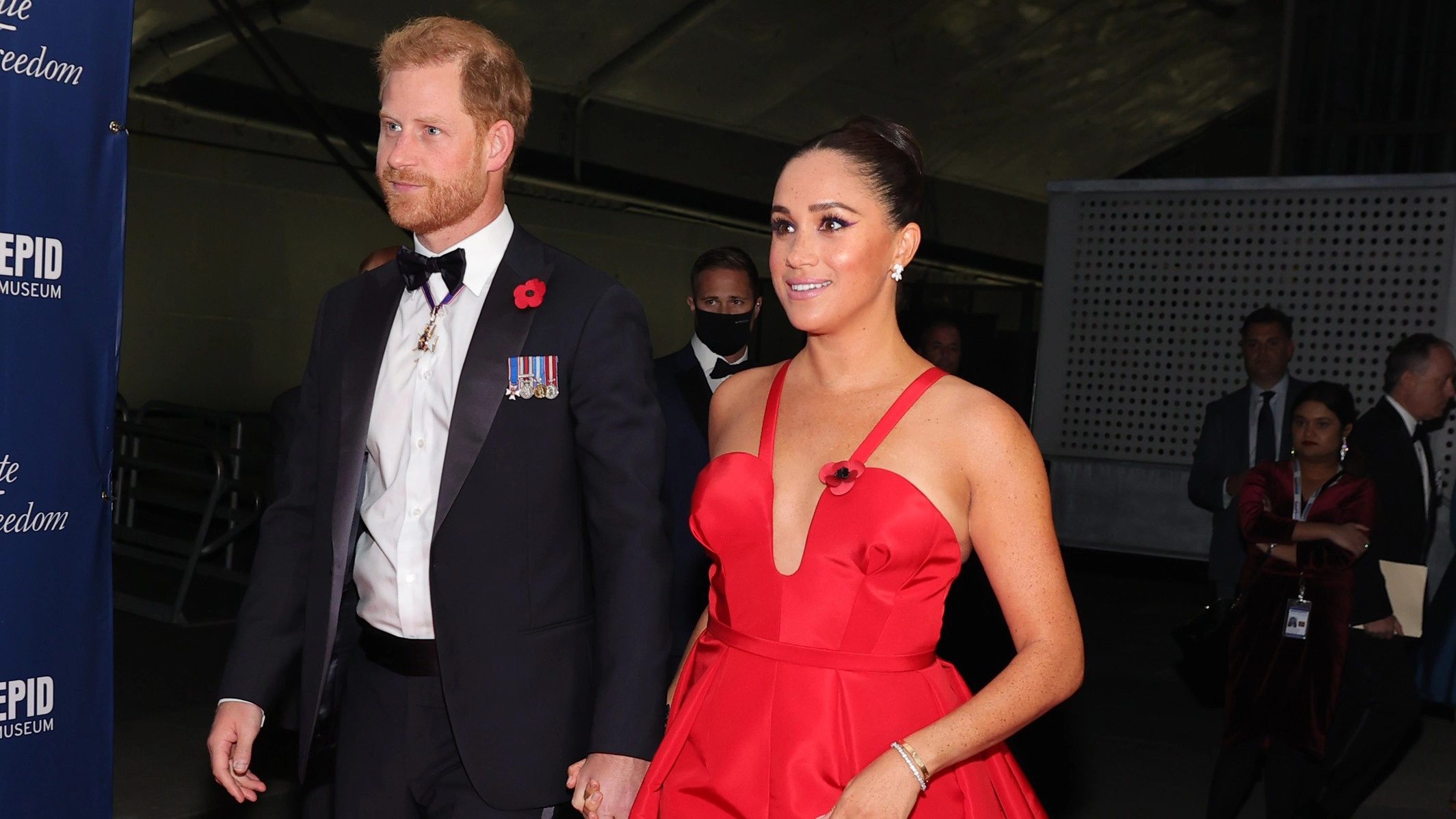 Meghan Markle and Prince Harry hit the red carpet in New York City on Wednesday night to honor veterans ahead of Remembrance Day in the U.K. and Veterans Day in the U.S. The Intrepid Museum's Salute to Freedom event saw Prince Harry present Intrepid Valor Awards to five service members past and present. On the red carpet, where she wore a show-stopping, fire engine-red Carolina Herrera ballgown, Meghan was asked if she was proud of Harry, who served in the British military for a decade. Her response: "I'm always proud of him," per People.