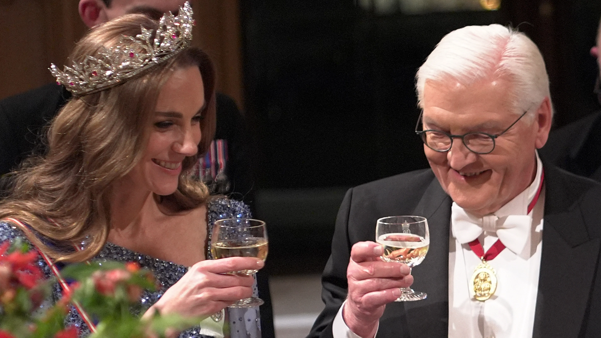 It’s certainly a blink-or-you-missed-it detail that’s only visible in a few of the photos of the Princess of Wales clapping and toasting during the banquet, and in one shot of her examining German artwork at the castle with Prince William. But indeed, Kate was wearing a barely perceptible, shimmery beige shade on her nails that caught the light in certain images. As Christine noted, the color was “almost like a glazed donut mani,” but just a bit more glossy.