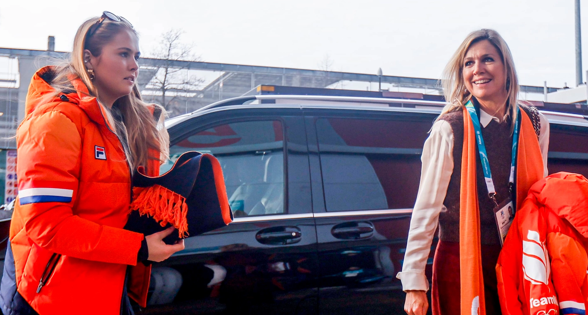 Mom, dad and daughter all matched in bright orange Fila Team NL puffer coats at the opening ceremony in Milan on Friday night, and they've been keeping the team spirit going ever since.