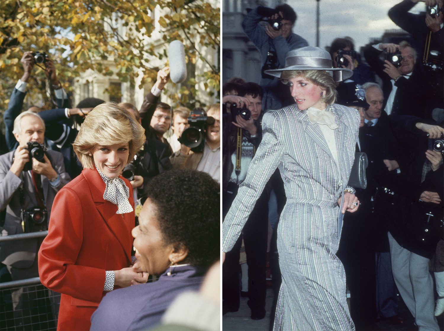 The royal press frenzy rose to a new level when Diana, Princess of Wales (seen here visiting Brixton Community Centre in London, 1983 (left) and at her friend Anne Bolton’s wedding, 1983) arrived on the scene.
