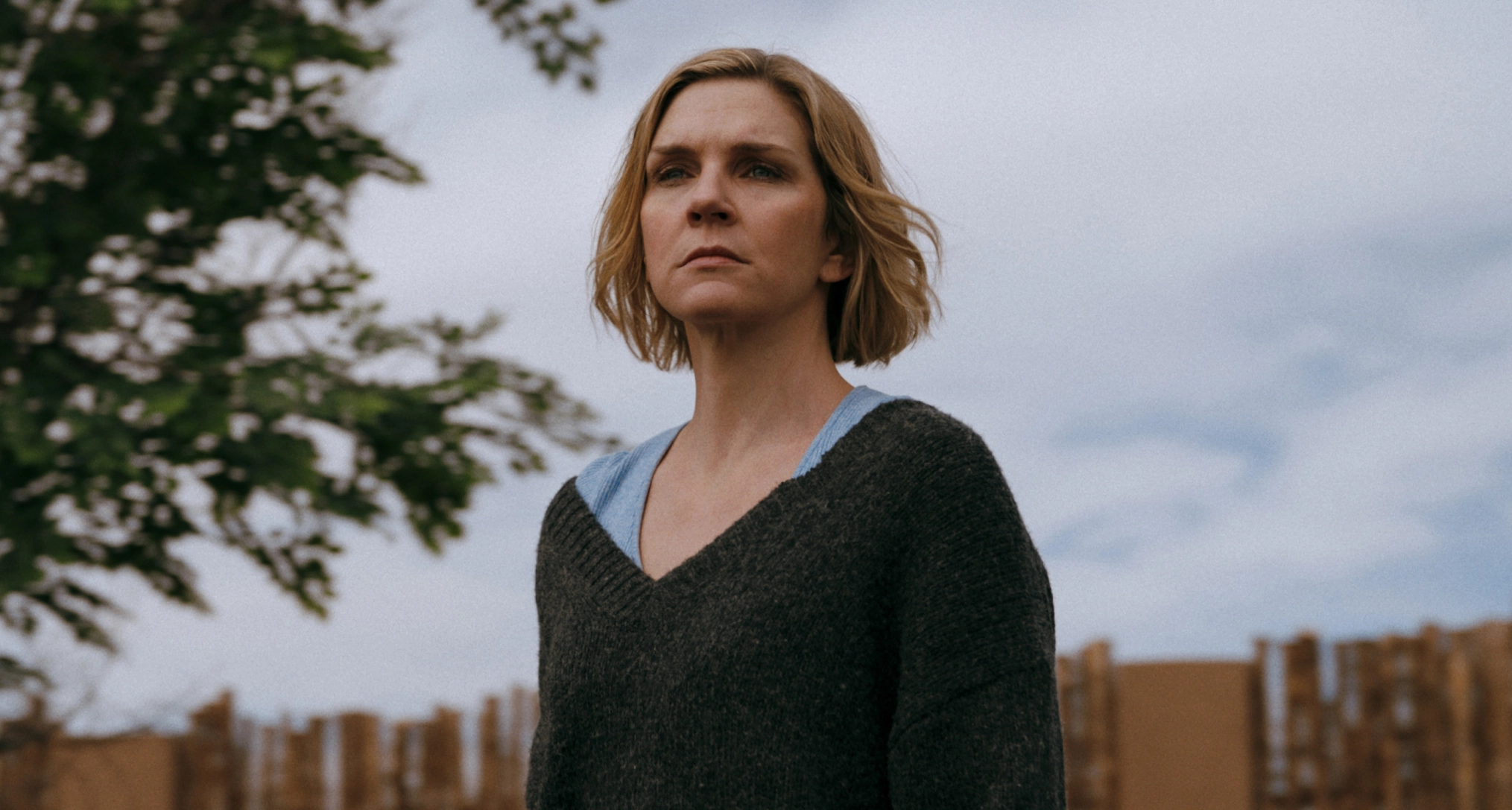 rhea seehorn as carol wearing a grey sweater standing in her yard and staring into the distance in pluribus season 1