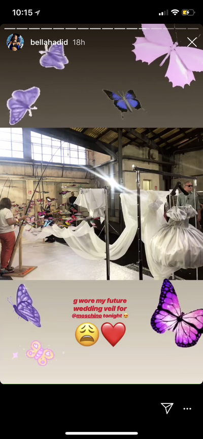 Hadid, who has walked in Scott's previous shows, was a natural choice to showcase this over-the-top dress. She held a bouquet of baby's breath while people behind her dressed in black pretended to be butterflies and held up her gorgeous veil, which her sis Bella already called dibs on.