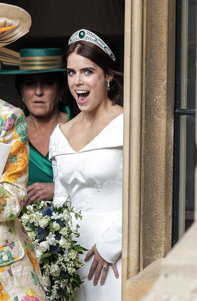 Earlier Friday, Princess Eugenie walked down the aisle of St. George's Chapel in a beautiful, Peter Pilotto wedding dress. She said her "I do" to Jack Brooksbank in front of 800-plus guests, including the royal family and celebrity friends like Naomi Campbell and Demi Moore. She looked beautiful in her designer gown and Emerald Greville tiara (loaned to her by her grandmother Queen Elizabeth). She also wore a pair of earrings that were a wedding gift from Brooksbank.