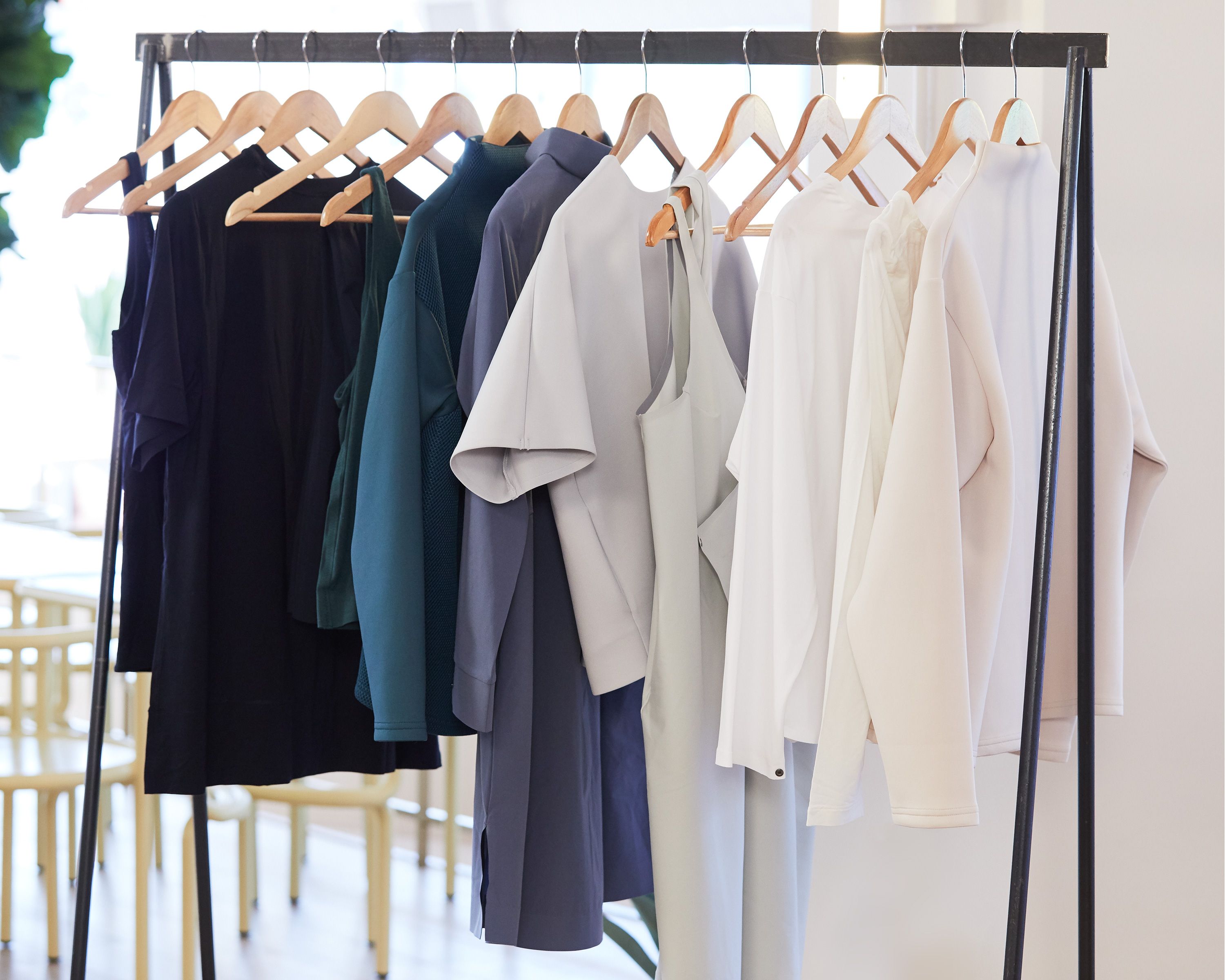The ADAY offices in Manhattan’s Chinatown are a flurry of activity: There’s a conference call happening in one corner and a meeting at a long wooden table in another. In the showroom in the space’s center, a regular customer is trying on some of the brand’s new pieces, while co-founder Meg He’s dog, Helix, weaves through the racks of T-shirts and tanks.