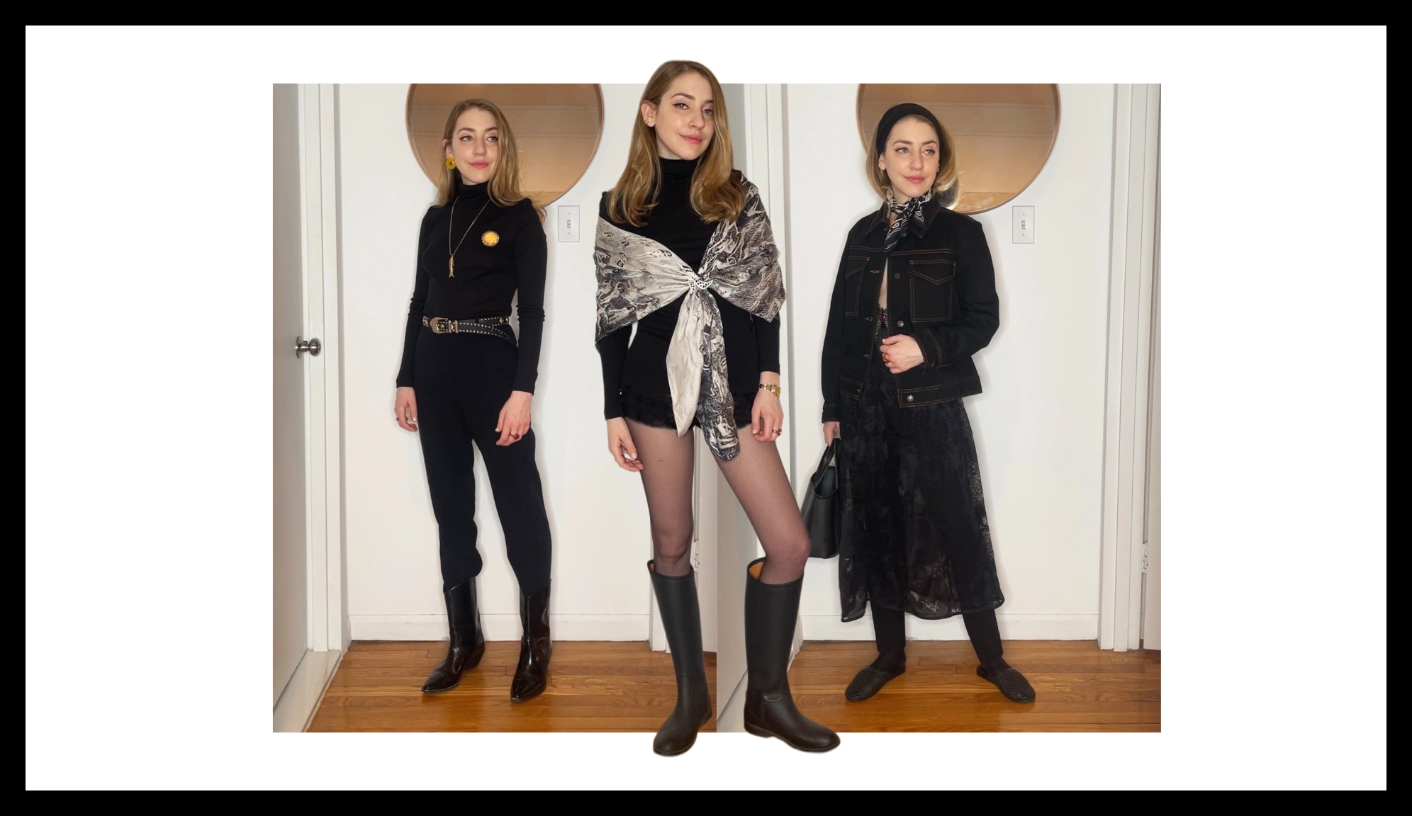 Starting with a turtleneck, trousers, and boots creates a simple outfit formula. The outfit is made personal through small focal points, or what I like to call the outfit's "entry points"—in this case, a brooch and a belt. The latter breaks up the silhouette, keeping the look from reading as a solid block of all-black. The proportion of the trousers paired with the boots also adds subtle shape, making the outfit feel considered rather than a basic uniform.
