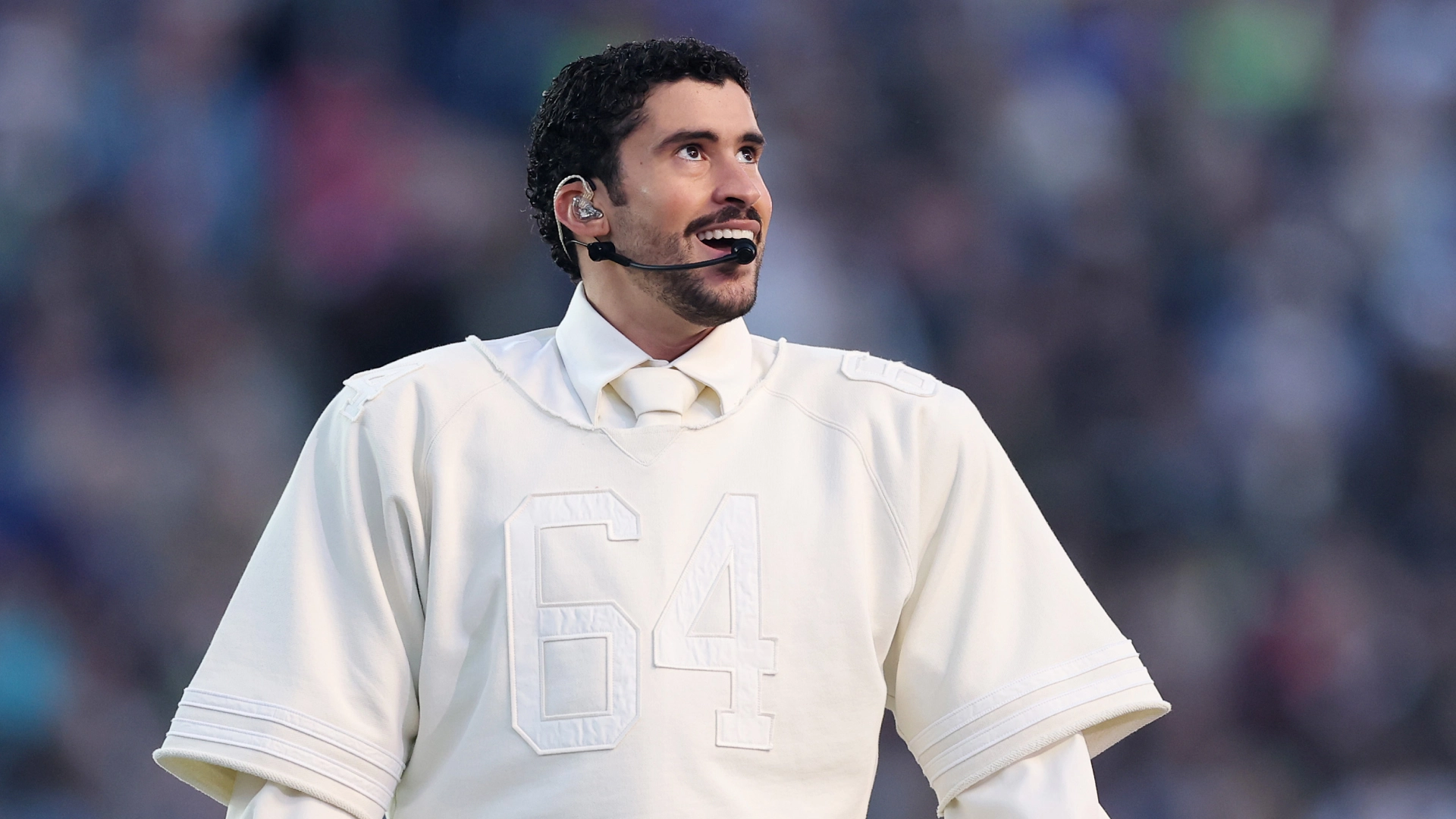 Bad Bunny previously appeared on the halftime stage at Super Bowl LIV, making a guest appearance during Jennifer Lopez's and Shakira's joint performance in 2020. He was styled by Pablo in a silver look from Berlin-based label Last Heirs, created in collaboration with Nike and Swarovski, consisting of a vinyl coat embellished with 13,000 crystals, sweater, and trousers. His custom Nike Blazers also bore Swarovski stones.