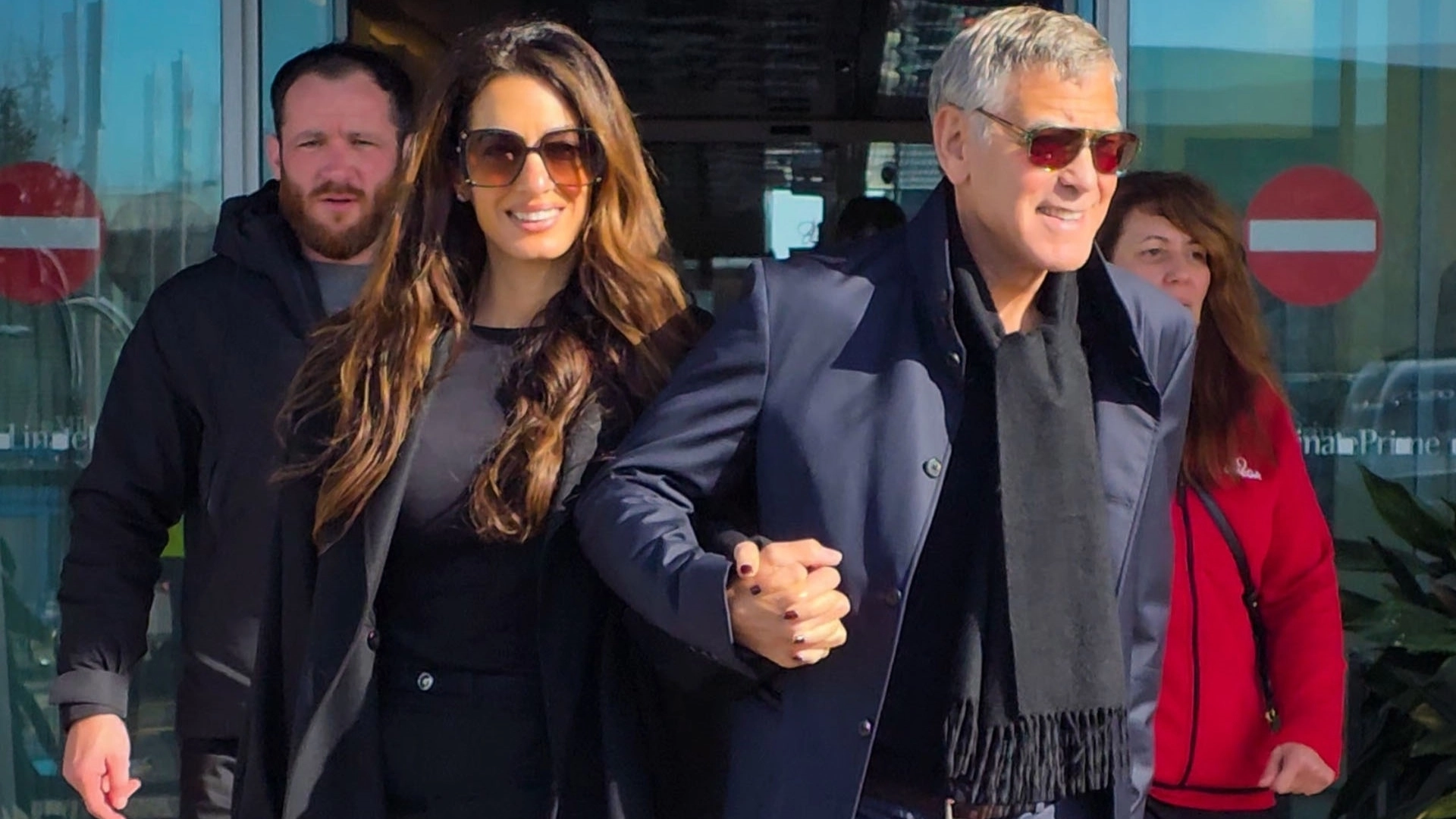 The couple were all smiles outside the airport—and, of course, they weren't wearing your average travel-friendly sweatsuits and sneakers. Alongside George in a navy blue suit, Amal stood out in chic Versace basics, beginning with a boatneck blouse tucked into a high-rise mini skirt. The all-black color story continued with semi-sheer tights beneath a single-breasted blazer.