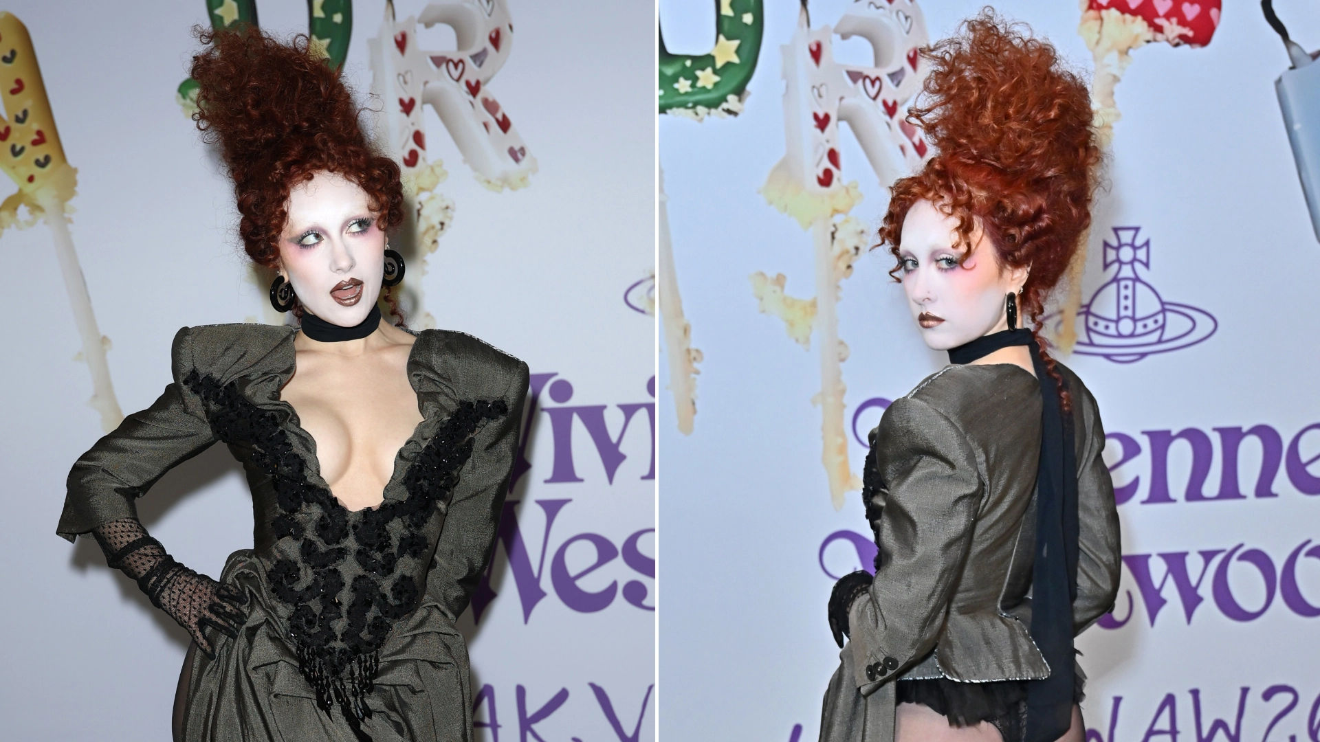 From the front, Roan's gown features a dramatic silhouette, including long sleeves, shoulder pads, and a plunging V-neck, with the dress narrowing at the waist before cascading into a gathered skirt. But from the back, the Vivienne Westwood gown takes on an entirely different identity.