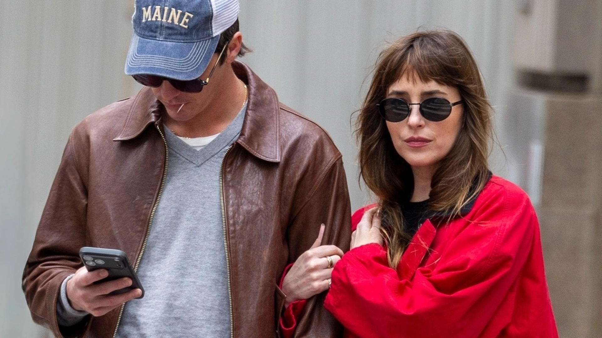 Article continues belowIt's difficult to see beneath her boyfriend's brown leather bomber jacket, but Johnson's favorite The Row Astra Bag made it to NYC. Much like her slippers, the burgundy bowling bag has been spotted on all of their public-facing dates this month. You may also recognize her oval-shaped Prada sunglasses, Cartier Love hoop earrings, or pinky Jessica McCormack ring from either of their April meet-ups in L.A.