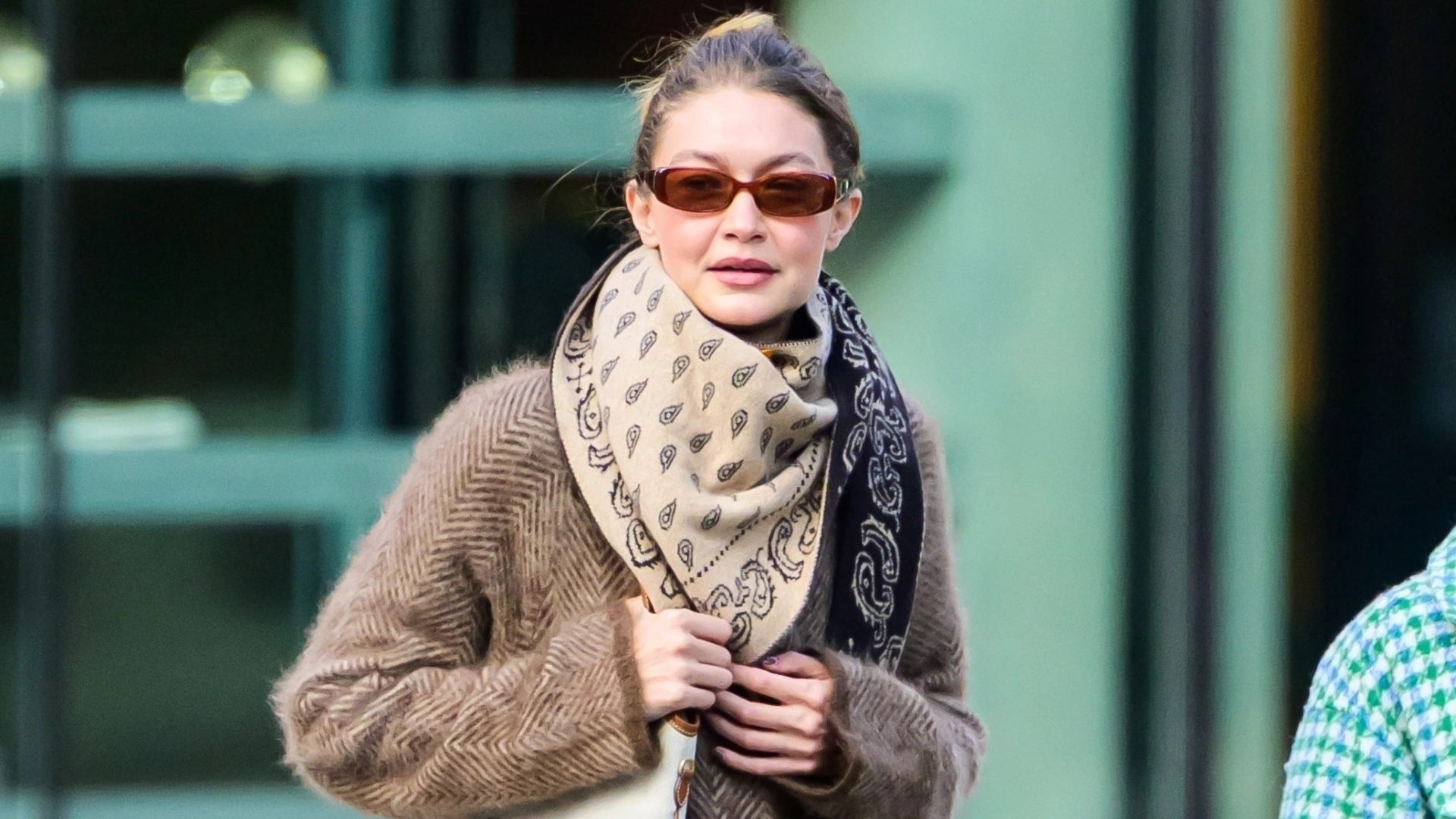 New York City was a frigid 45° on Tuesday morning, but that didn't stop Hadid from reaching her step count. She bundled up in a boho-chic brown palette, beginning with a herringbone double-breasted coat. Buttoning it up hid most of the street style selects beneath, except for wide-leg tan sweatpants. Hadid traded an oversize cashmere scarf (a staple among A-list New Yorkers) for a bandana-style scarf. Perhaps she stole it from her younger sister, Bella Hadid's closet, in all its horse girl glory.