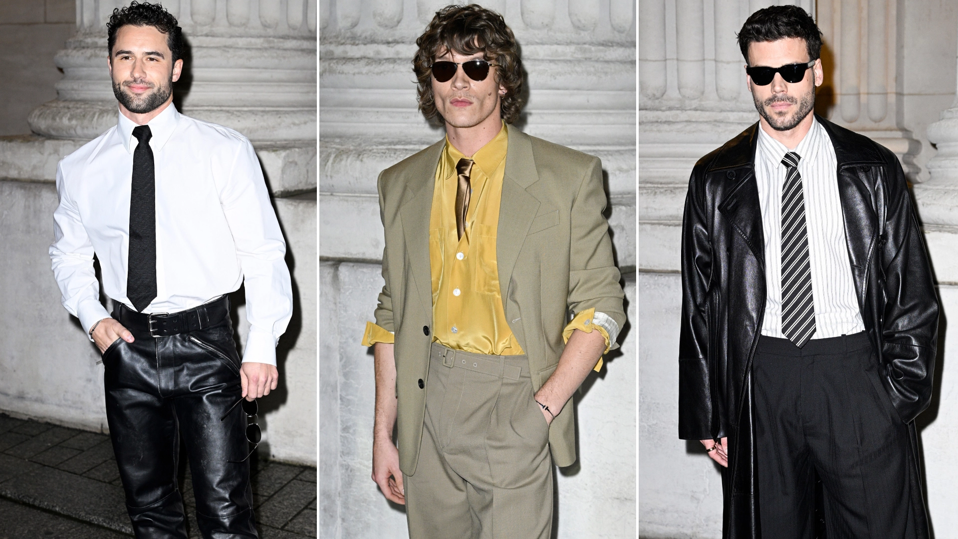 Stylist James Yardley stacked a mustard yellow button-down beneath a shoulder-padded khaki blazer, which complemented his high-rise trousers. (It's giving Patrick Swayze-level suave, right?) To match the effortless, cool-guy charm of his rolled-up sleeves, Storrie accessorized with aviator sunglasses and a metallic bronze tie. Half of it remained inside the button-down; a signature motif in creative director's Anthony Vaccarello's Spring 2026 show. (Tucked-in ties returned this time around, too.)