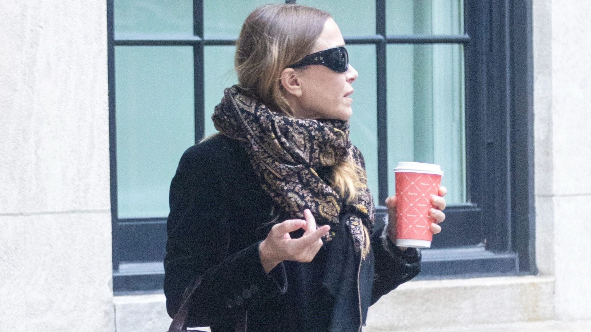 One of these It girls is not like the other. The Olsen twin rarely graces New York City's sidewalks with her The Row-clad presence. But five months after her latest public sighting—with Kendall Jenner in West Hollywood—Olsen stepped out in an elongated, black velvet coat topped with a paisley scarf and shield sunglasses. Black, wide-leg trousers, a day and nighttime staple for both Mary-Kate and Ashley, followed underneath.