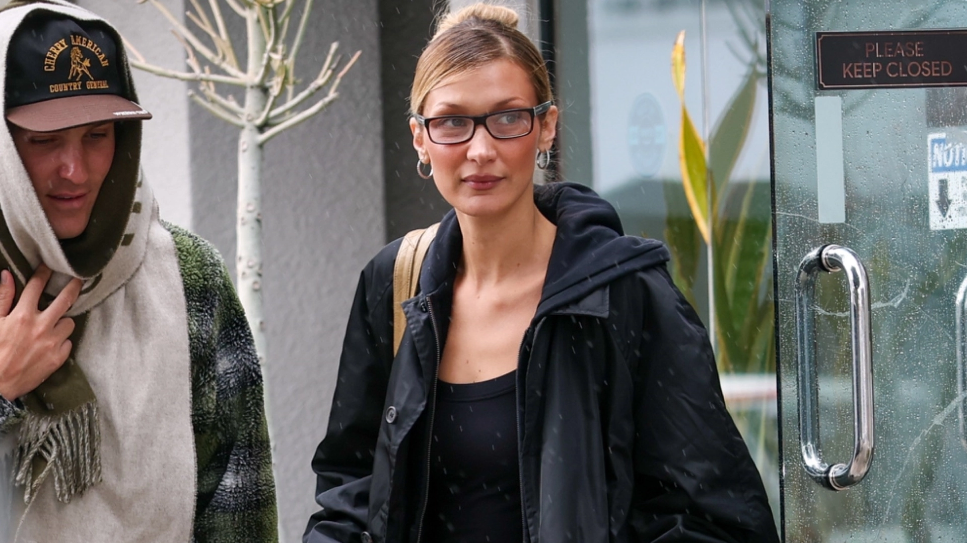 Hadid's athleisure matching set doubled as a dog walking outfit around L.A. She opted for almost all-black selects, including a scoop-neck tank top, skintight leggings, and a knee-grazing windbreaker. Even her chunky Nike Shox TL sneakers got the noir memo, apart from crimson red stitching on each tongue.