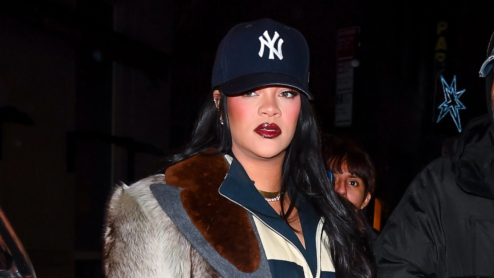 Rihanna wearing a Prada fur coat, Loewe two-tone boots, a casual track jacket, and a baseball cap.