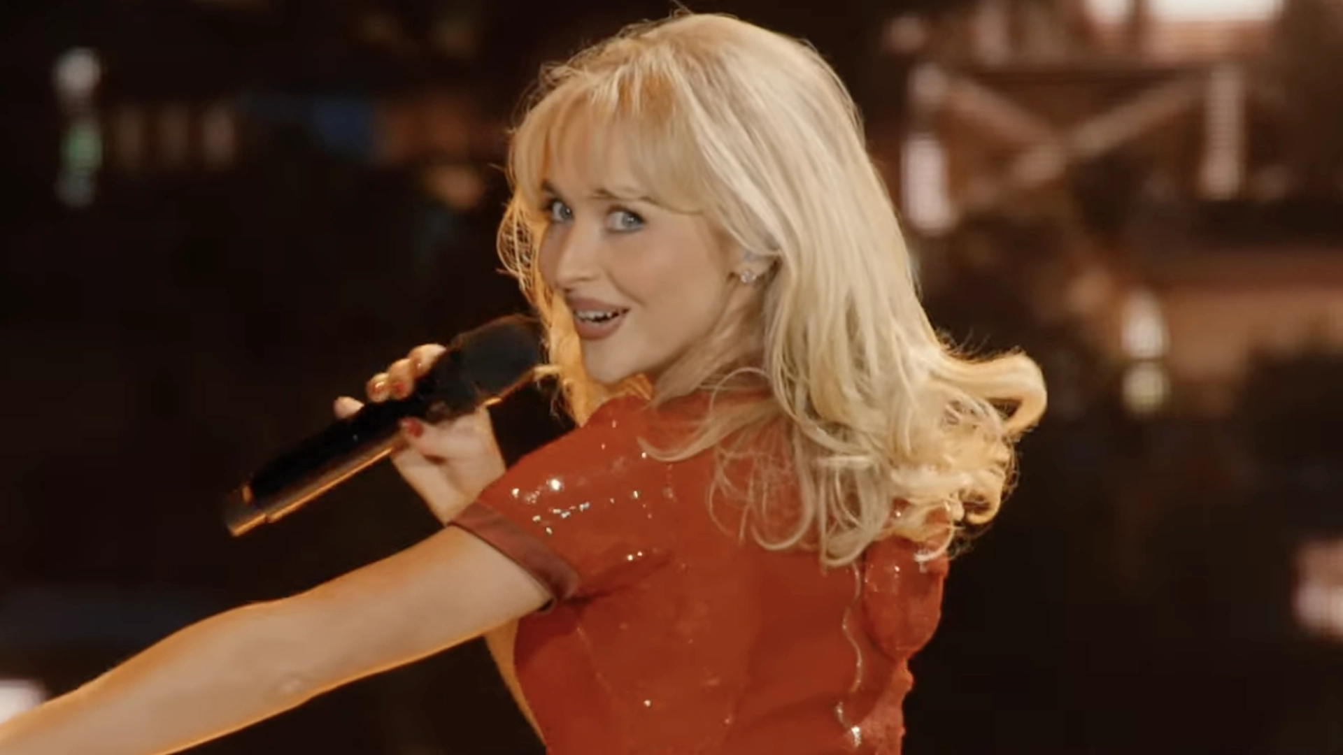 Then, Susan Sarandon delivered an Oscar-worthy monologue as mature Carpenter, while the 26-year-old changed into a cobalt blue turtleneck. The Spring 2026 color trend transformed into an '80s homage straight out of A Chorus Line when semi-sheer black tights acted in lieu of pants. Once the faux dance audition wrapped (and the ballet barres disappeared), she re-wore the red-and-black coat to sing "Don't Smile."