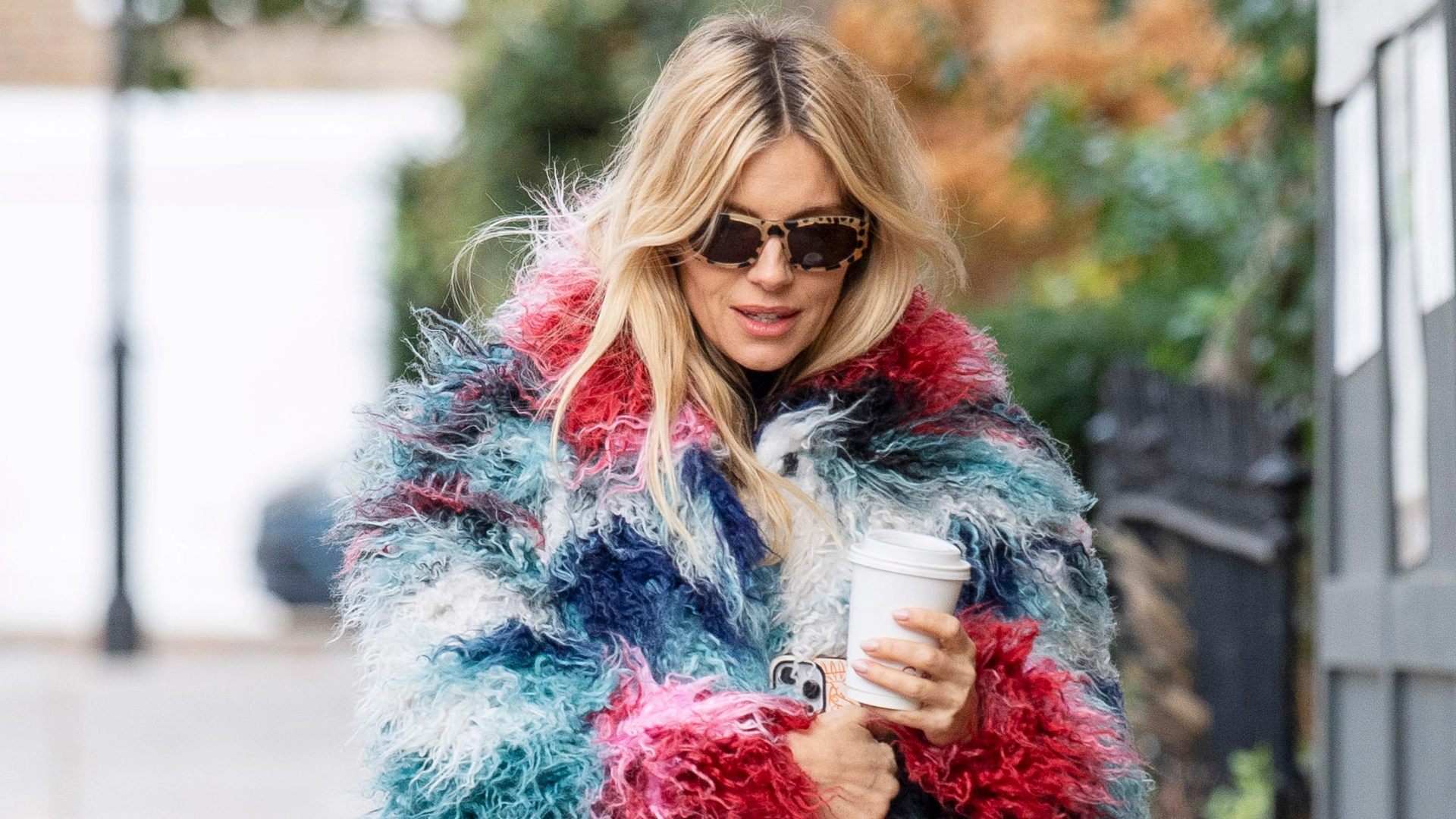 Photographer spotted the actor in London's Notting Hill neighborhood, where the New York-born star originally grew up. She looked every bit a London girl in jeans and a statement coat. Miller curated her street style set around a red, white, and blue fur coat, courtesy of Desigual by Christian Lacroix. The $359 jacket's elongated shearling was so voluminous, you couldn't see her shirt underneath.
