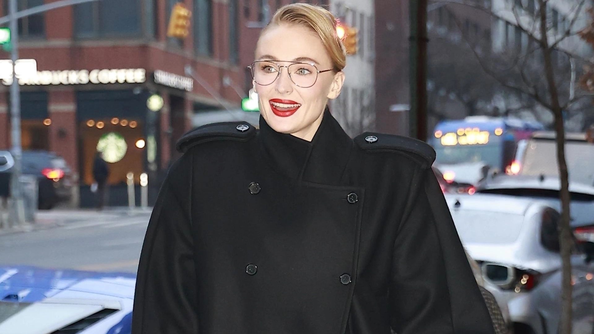 Sophie Turner looked straight off a Spring 2026 runway in the military coat trend.
