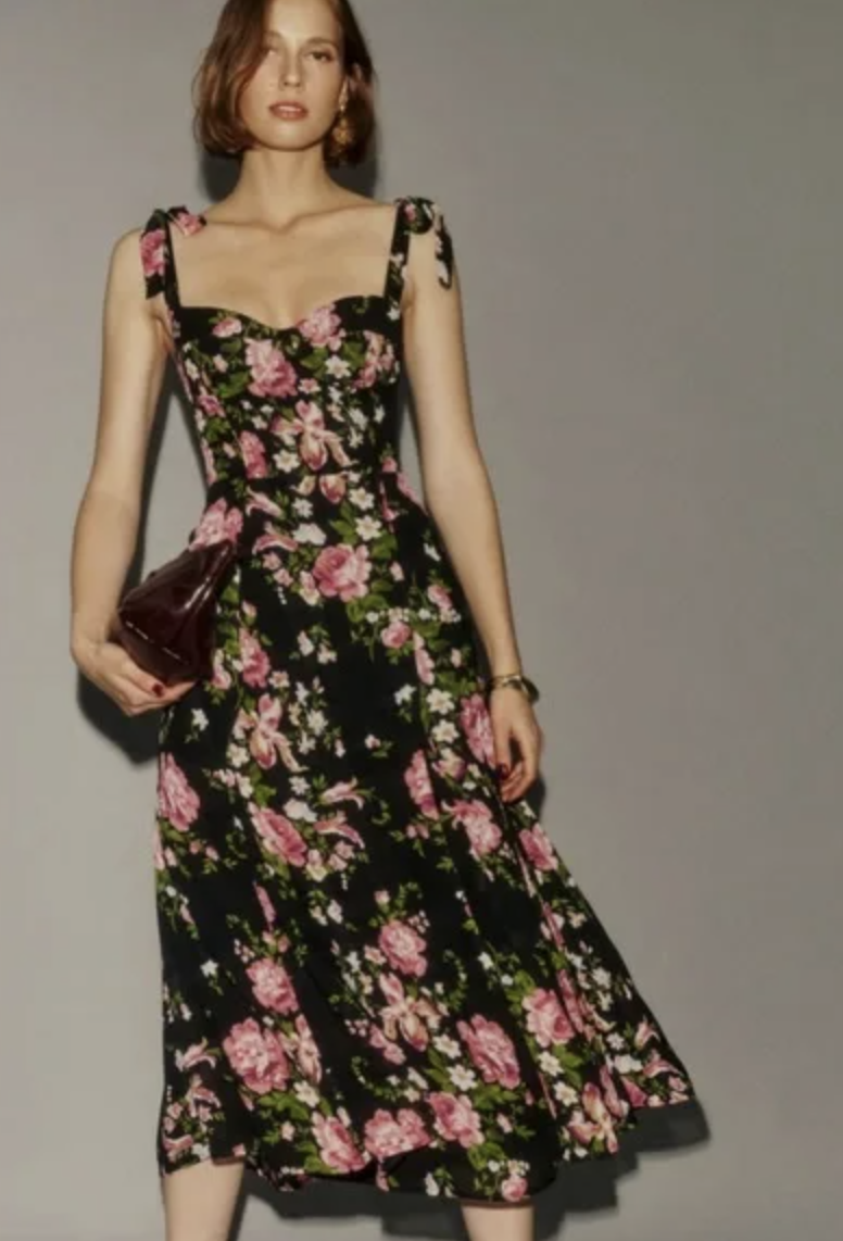 Dakota Johnson's final Materialists outfit: a Reformation floral dress and Converse sneakers.