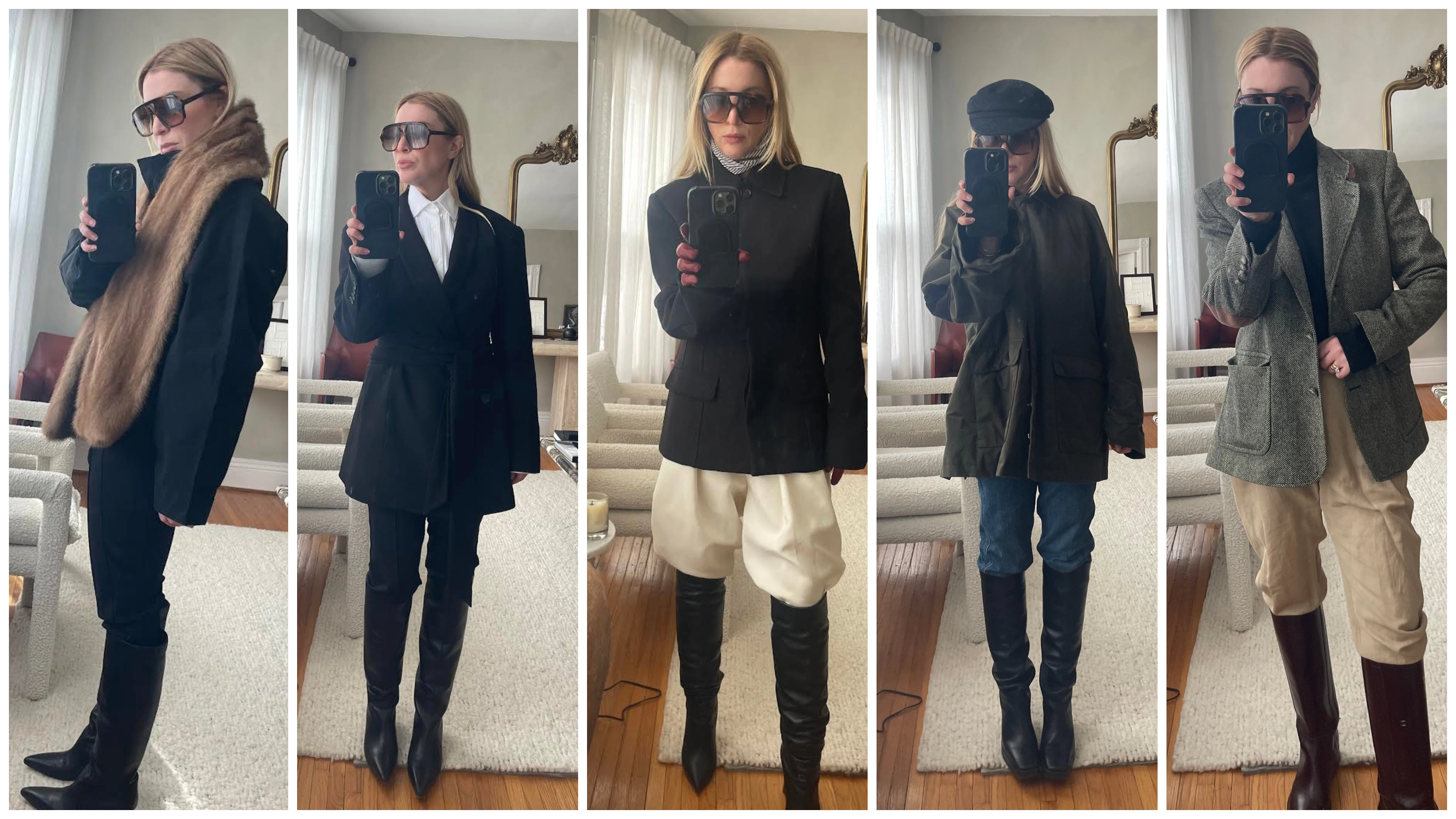 The formula for achieving equestrian vibes without feeling like you’re playing dress up comes from melding the elegant with the sporty. Think: a knee-high boot, some sort of jacket, and pants that are either fitted or a straight-up pair of jodhpurs, the barrel-leg, specialized trousers for horse riding. A nice styling trick I’ve discovered is that slightly baggy trousers look like a jodhpur when tucked into boots. Do I personally own jodhpurs? As a horse girl exclusively in spirit, of course I do.