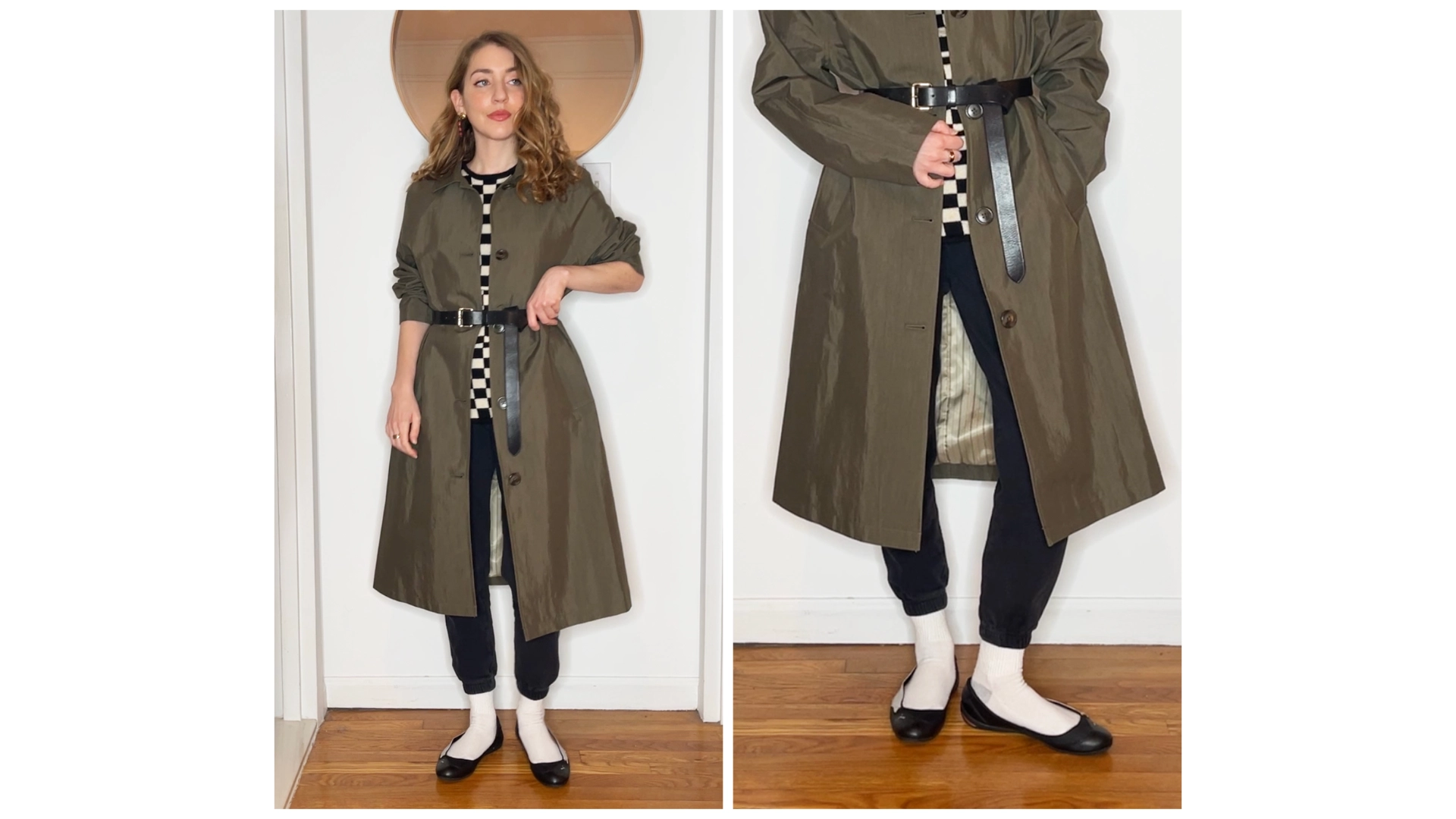 Next up, I belted the jacket so the hem would flare slightly, highlighting the puff of the sweatpants. I went sporty on the bottom (sweats and black flats) and more refined on top (a car coat and patterned knit). The inspiration: an Upper East Side woman meets an East Village student running errands. That’s kind of the point of shlubwear, no?
