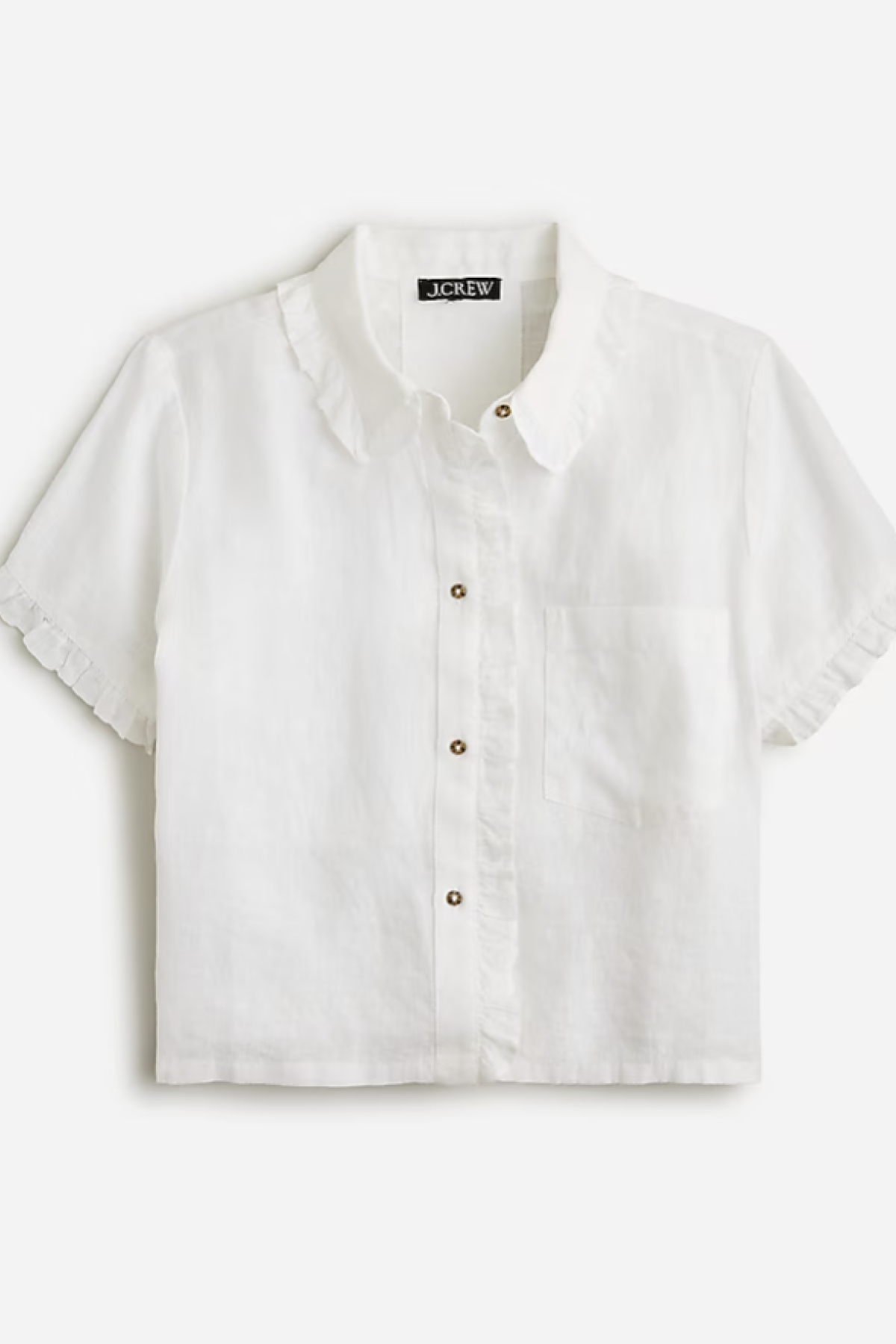For sweltering hot days when you can't seem to bring yourself to slip on a long sleeve top, turn to J.Crew’s ruffle-trim button-up shirt. Aside from being airy, this piece is also an elevated alternative to a plain white T-shirt, so it’s great for refined occasions.