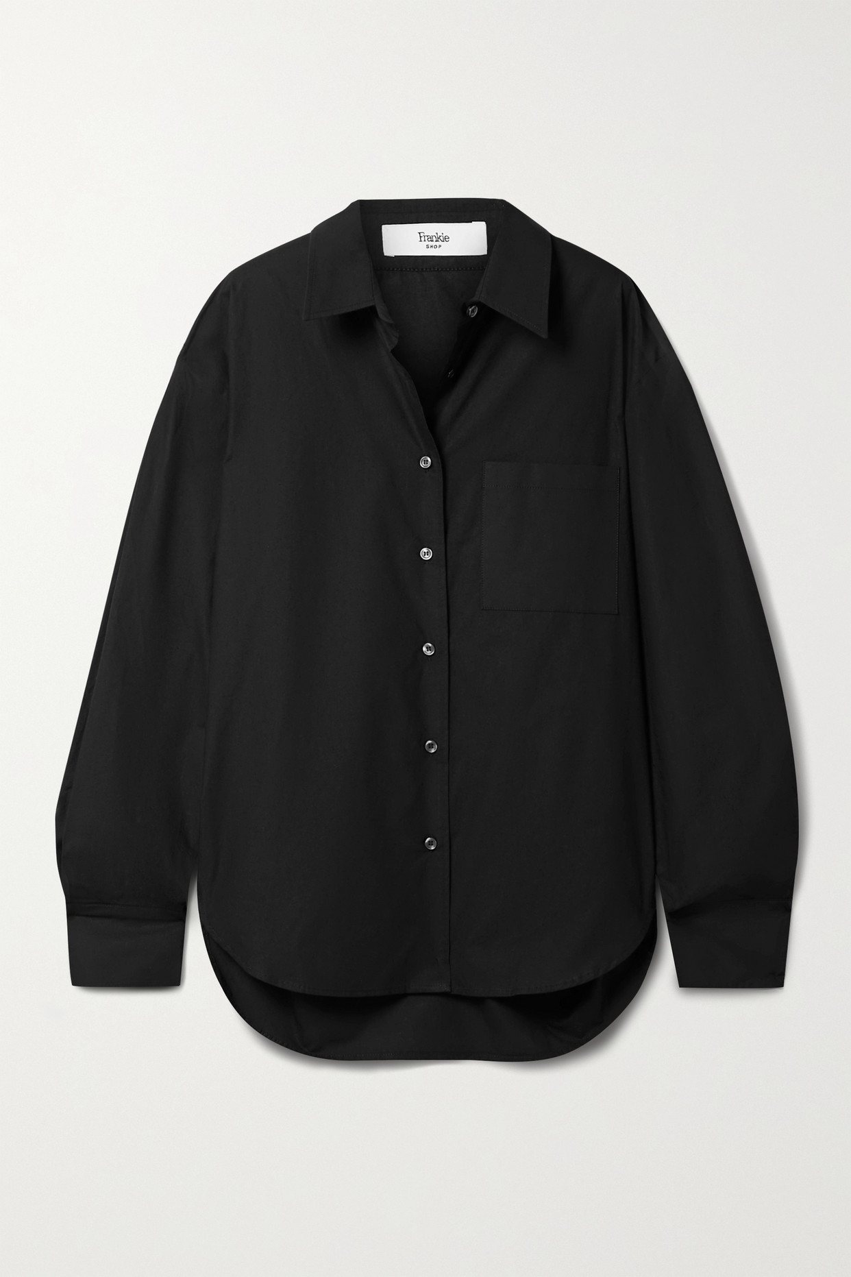 Again, she wore an oversized button-up shirt and loose-fitting trousers. Since her look was so successful the first time around, she styled Pt. II with identical accessories. She reached for the same black-frame sunnies and another pair of clogs, in cobalt blue.