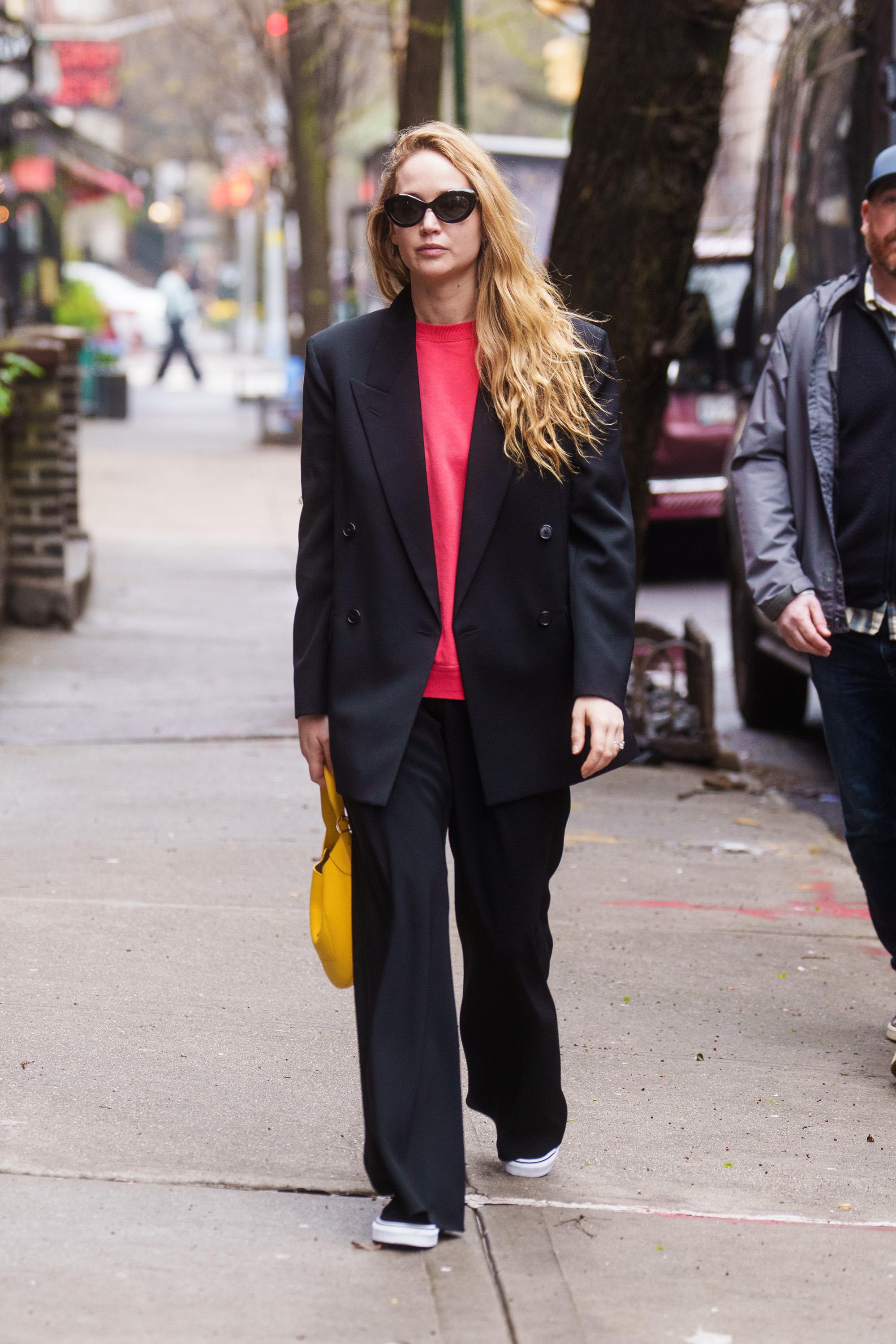 Lawrence isn't the first A-lister to love the Nike V2K Run sneakers, and I have a feeling she won't be the last. She swapped the white pair that Kendall Jenner and Kaia Gerber own for a black version. On an unseasonably cold spring day, Lawrence gave hers some East Coast street cred, courtesy of a brown coat and slouchy, cool layers. File this under: Reasons to diversify your sneaker selection.