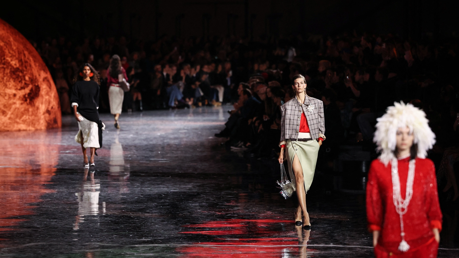 "I'm living vicariously through Nikki as she sends Marie Claire live dispatches from the ground. The set—with its colorful planets scattered throughout the venue—reminds me so much of the Karl Lagerfeld era, where each fashion show had an elaborate themed production. (Fall 2013 had a globe that marked where Chanel boutiques were located across the world.)" —Ana Colón