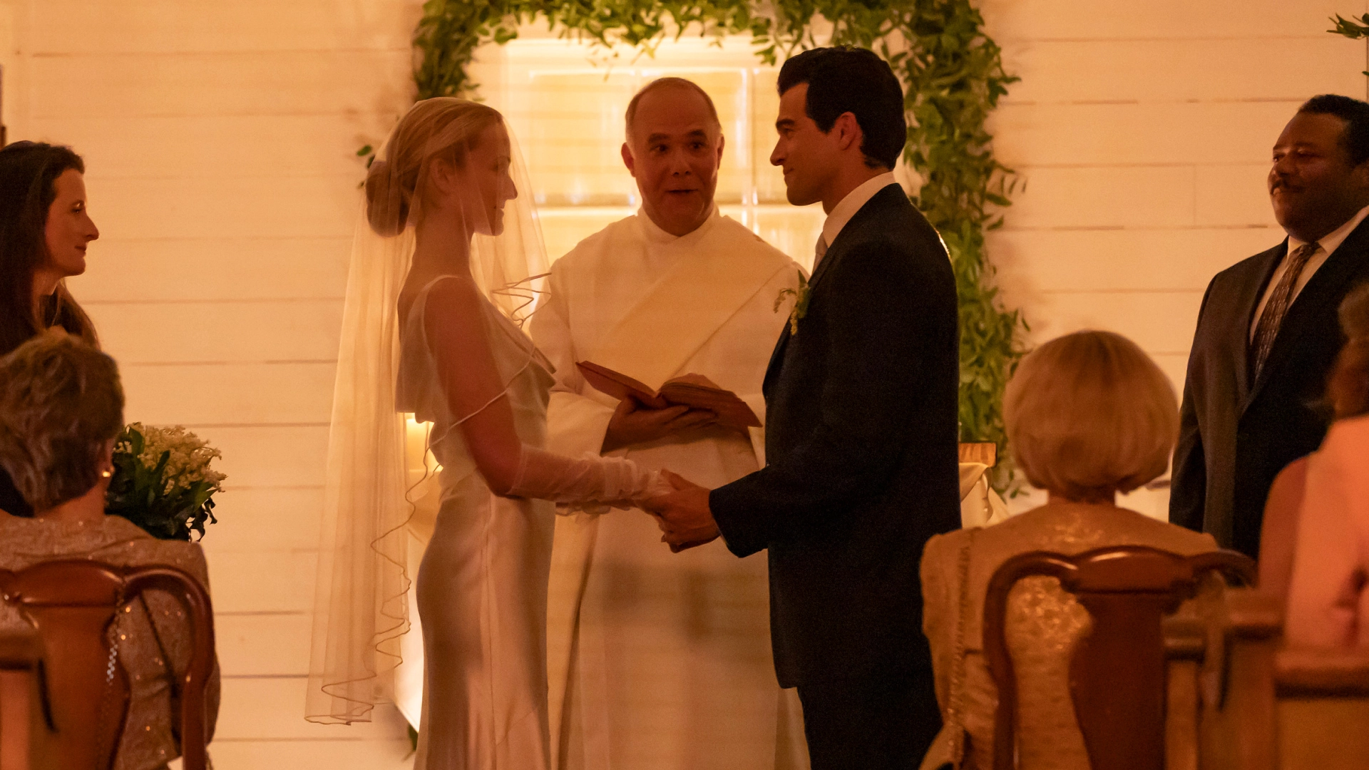 Exchanging vows in Love Story's depiction of CBK and JFK Jr.'s wedding.