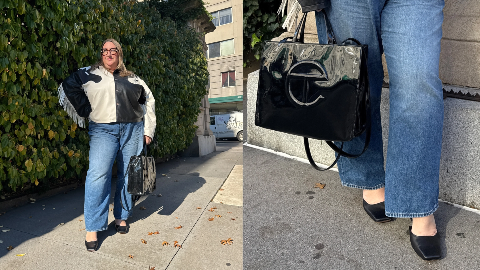 For a weekend look, I styled these casually with Madewell jeans and my beloved Fashion Brand Company Dueling Horses jacket. This pair looks great with so many denim silhouettes, as well as wide leg trousers and a perfectly fitted tee. I'd also wear them peeking out from under a fitted maxi dress with a voluminous bomber jacket on top.
