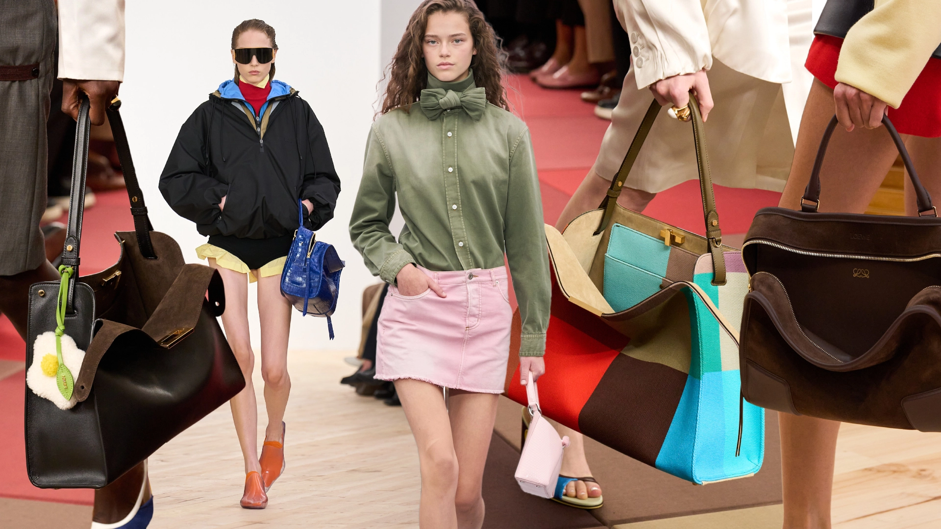Jonathan Anderson’s womenswear debut at Dior included baby pink and blue bow-bedecked bags, each hanging from a single leather strap and swinging at an angle. Fendi’s Spring 2026 accessory lineup featured solo-strapped Peekaboos with sides filleted open to reveal colorful sequined interiors. At Loewe, newly-appointed creative directors Jack McCollough and Lazaro Hernandez presented the first glimpse into what’s in store for the It-bag-making machine of a brand: single-strap leather Amazona 180s, carried haphazardly in models’ open fists, purposefully left unzipped, and slanted 45 degrees to the right.