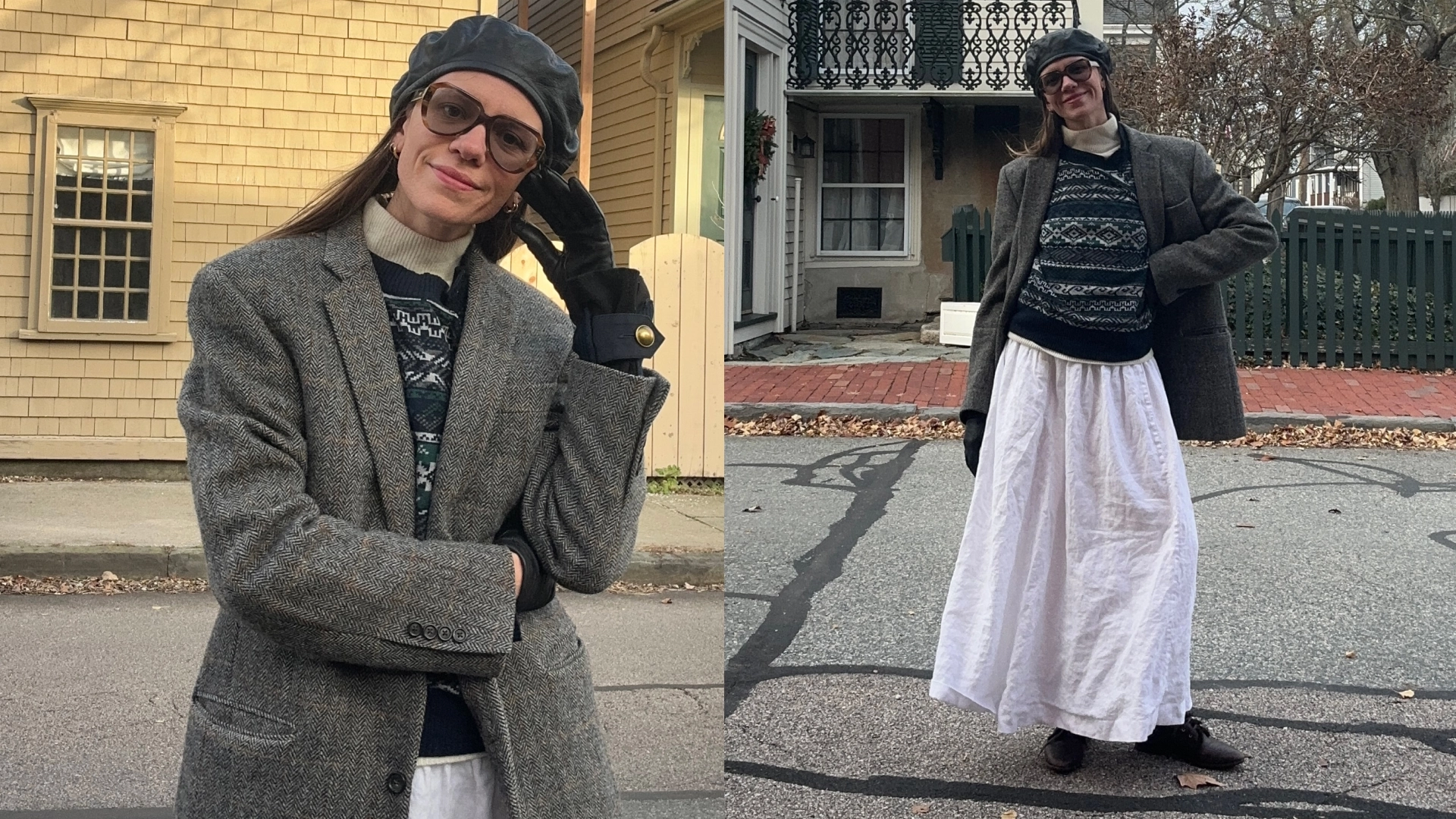 I found inspiration for this look from a 1995 Ralph Lauren ad that featured a woman and child ice skating in cozy skirt-and-ski-sweater combos. This thick, double-layered linen Reformation skirt I found on The RealReal has proven to be a seasonless essential that works just as well in summer as it does in winter, when layered appropriately. The swooshy-ness felt fun for running around town doing some Christmas errands with a hot cocoa in hand; I paired it with an old Sacai knit sweater, my husband’s tweed blazer as a coat, and some random leather accessories, like a beret, gloves, and old-timey lace-up shearling boots.