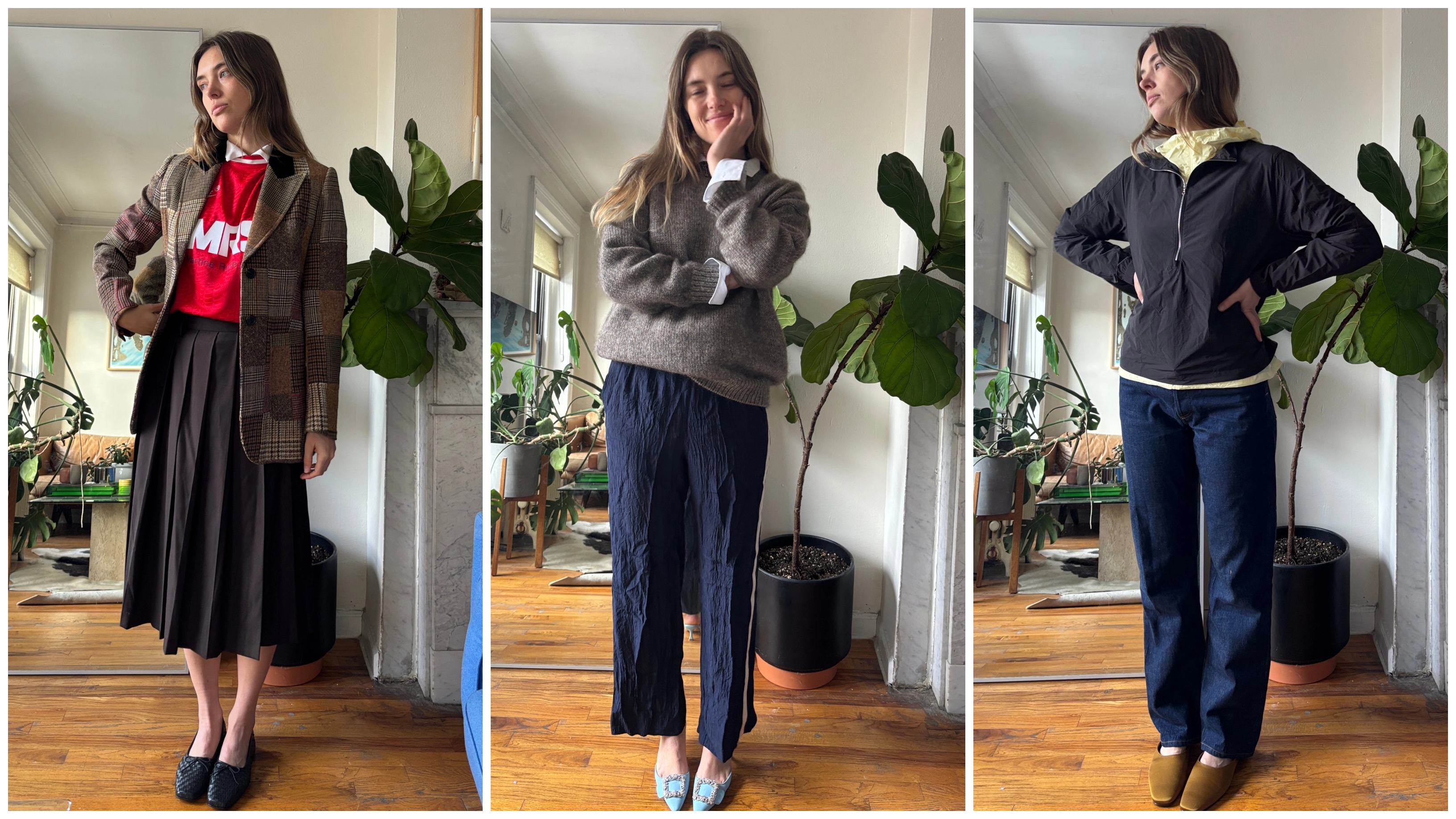 Here, I leaned into tailored separates, including a pleated skirt from Korean label Dunst, and a patchwork Miu Miu blazer. There’s something a bit British about all these things worn in tandem, so perhaps it’s a look I’d break out on my next trip to London (or at least to watch a World Cup match stateside).